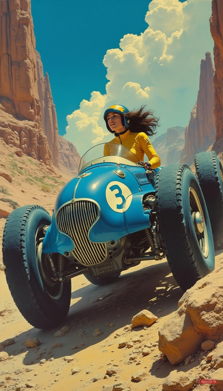 Classic gorgeous simon bisley pulp art of Syd Mead blue with blue wheels colossal race car, off - road that have obtrusive, stiff structures that confer authority and control. Muscular race driver woman in close fitting yellow space suit, helmet on set on vast bob ross style lake valley landscape. Switch panels, display systems, and communications equipment for the spacecraft interiors from Kubrick Art of 2001 A Space Odyssey. Highest level of technical realism, art by Richard Corben and simon bisley, great dutch masters painting of black, brown hair Barbarella, realistic painting 1970s, fantasy art, futuristic intricate details, god rays pastel volumetric light, eerie Don Lawrence style, ultra chiaroscuro effect, hyper real, uhd