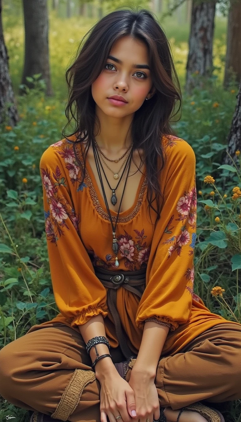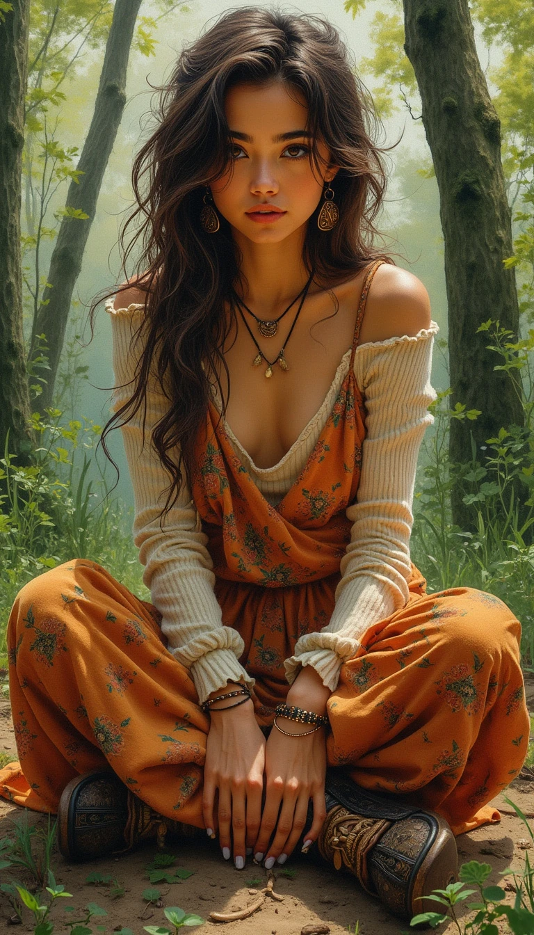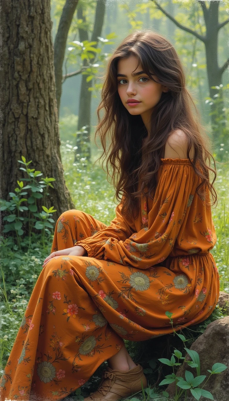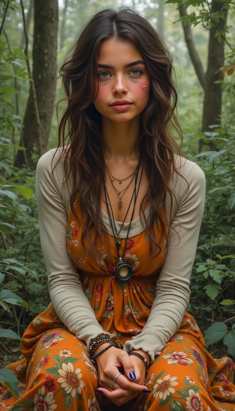 triptych style, by Ata Kandó. Style of Élise L'Heureux. Fantasy art. Oil Pastel. Wet-on-Wet. A 18 year old with Arabic features. Tan. Shadaria Kalil is petite. She is thin but scrappy. She resembled Sarah Hyland’s face, with thick bushy eyebrows and slightly unkempt brown hair. She has olive green eyes. She is very earthy and dressed in a bohemian style. She is a Wiccan. She wears a long sleeved ribbed top, with a burnt orange floral dress over top. She wears brown burlap pants, and moccasins. Sitting in a outside in the forest.