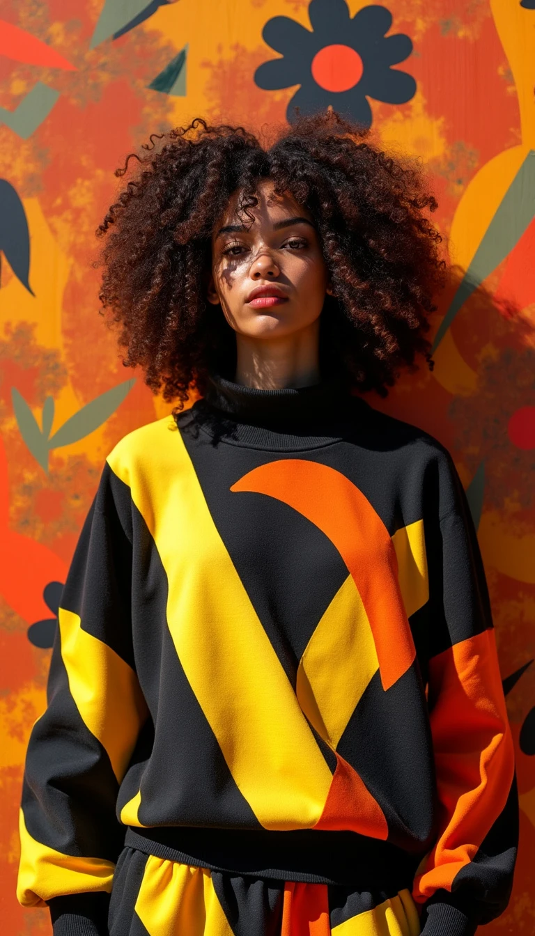 A confident model stands in front of a brightly colored, patterned wall, wearing an oversized sweater adorned with a Memphis Group-inspired print in black, yellow, and orange. The bold geometric patterns of both the sweater and the background create a striking contrast, while bright lighting casts sharp, dynamic shadows on her face. Her curly hair is styled into large waves, framing her face as she gazes directly at the camera, exuding modern confidence. The overall composition feels playful yet chic, with a strong focus on pattern and form.