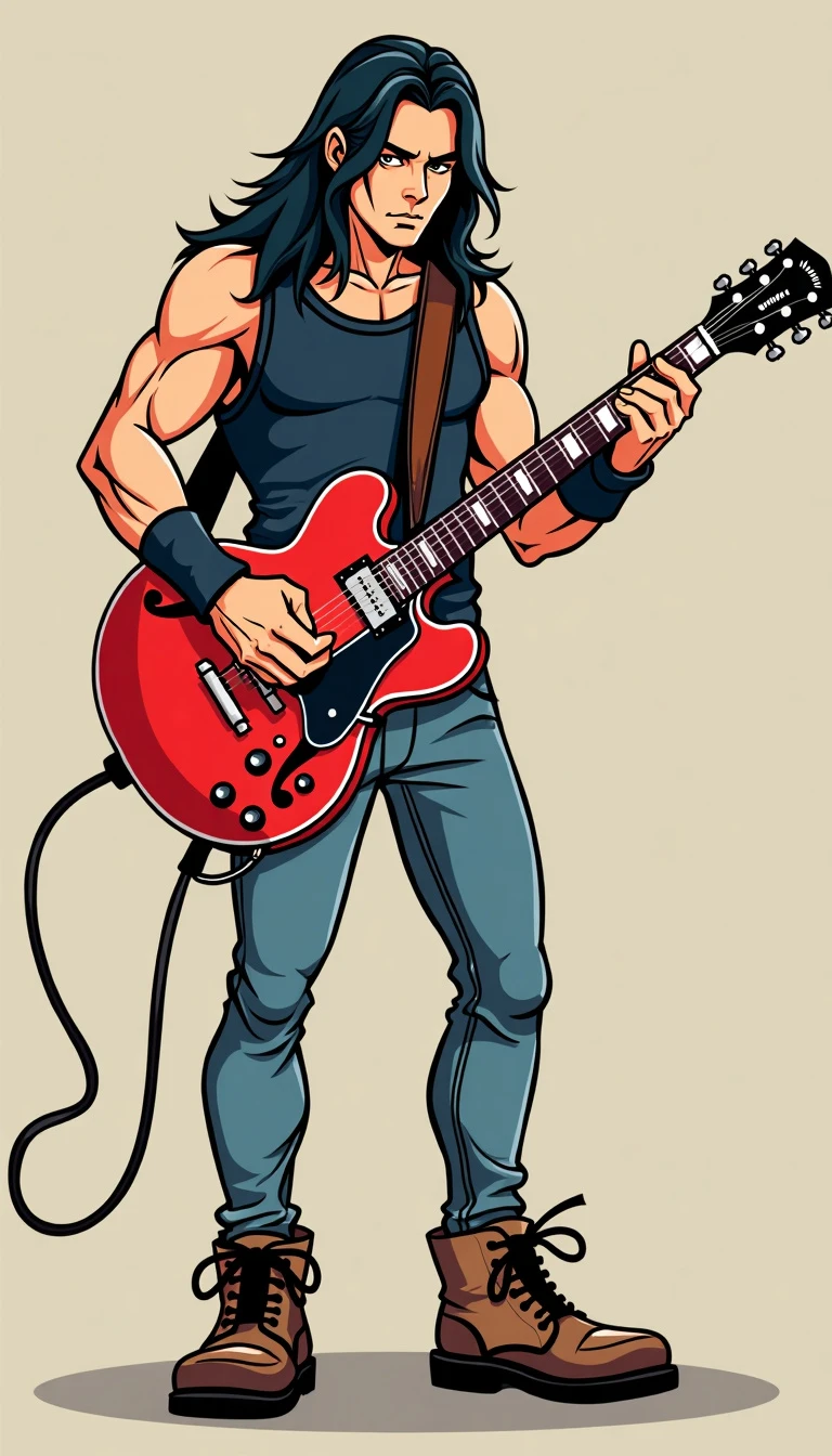 Full body rock musician with guitar male character. Funny cartoon.