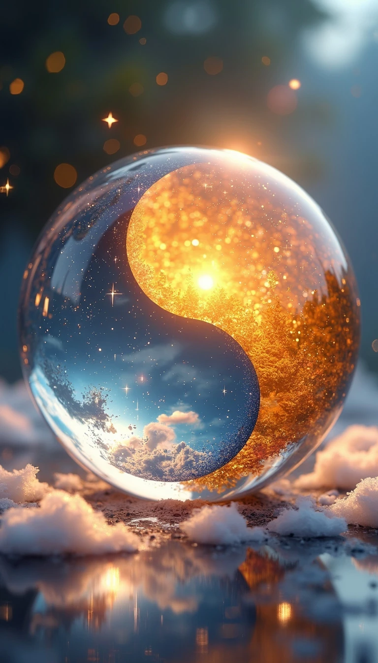 Ultra-realistic image that combines the concepts of yin and yang, sun and moon, night and day. Place a beautiful translucent volumetric glass ball with a smooth, shiny texture in the center of the composition, which has a slight rainbow effect on the surface. The transparent glass of the ball should reveal a volumetric internal mixture of yin and yang: on one side, a bright sunny morning with golden rays of light breaking through light, fluffy clouds, creating a feeling of warmth and joy. On the other side, a mysterious moonlit night, strewn with sparkling stars and soft silver light, evoking a feeling of calm and tranquility. Add magical elements to the background: light, translucent clouds that move smoothly, and twinkling stars that create a sense of depth and infinity. Use abstract lighting effects, such as soft glowing halos around the ball and sparkling particles that add dynamics and mystery. The background should be slightly blurred to focus attention on the ball and its contents, using soft gradients from bright gold tones to deep blues to emphasize the contrast between day and night. Create an atmosphere of harmony and balance, conveying the emotion of unity of light and darkness.