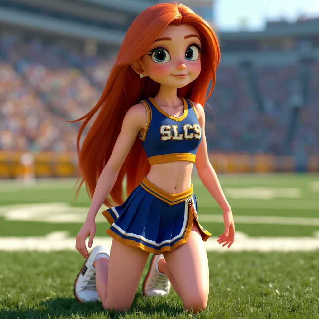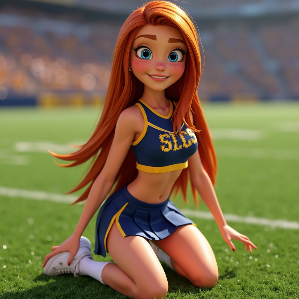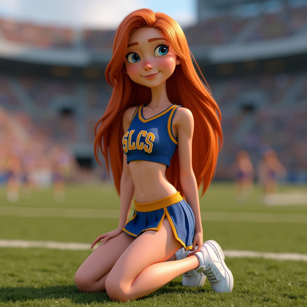 Disney Pixar 3d animated movie character. Real 3d style. Pretty red haired woman, long straight ginger hair, blue eyes. Pale white skin with freckles. Beautiful gorgeous stunning. Relaxed facial expression. Cheerleader uniform in blue and gold. Cropped sleeveless top with the letters SLCS. Pleated skirt with side slit and gold stripe. White sneakers. Kneeling up on grass in a football stadium.