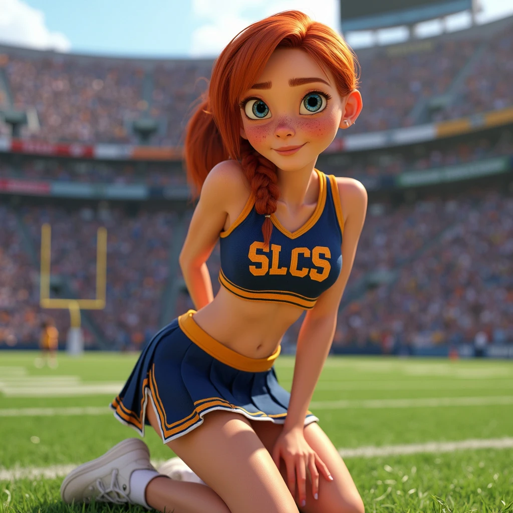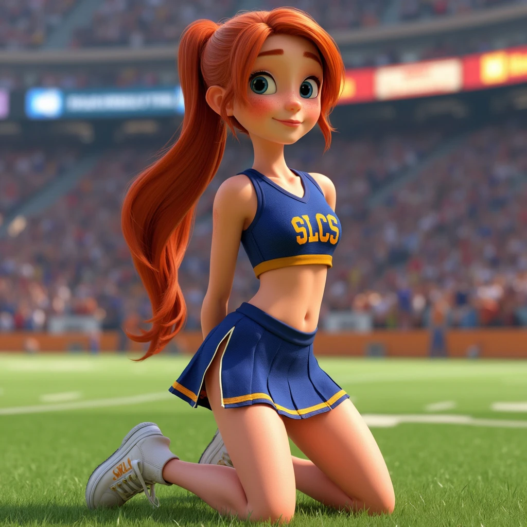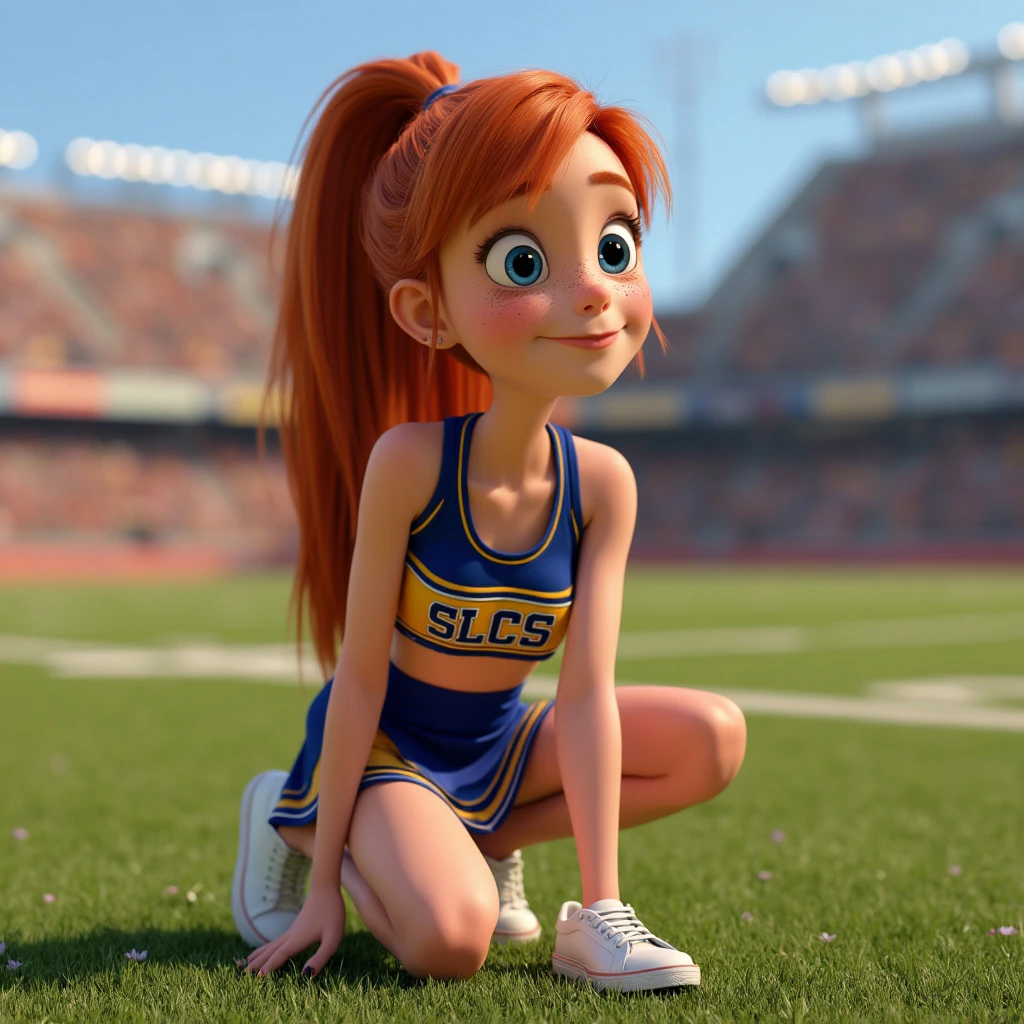 Disney Pixar 3d animated movie character. Real 3d style. Pretty red haired woman, long straight ginger hair in a ponytail, blue eyes. Pale white skin with freckles. Beautiful gorgeous stunning. Relaxed facial expression. Cheerleader uniform in blue and gold. Cropped sleeveless top with the letters SLCS. Pleated skirt with side slit and gold stripe. White sneakers. Kneeling up on grass in a football stadium.