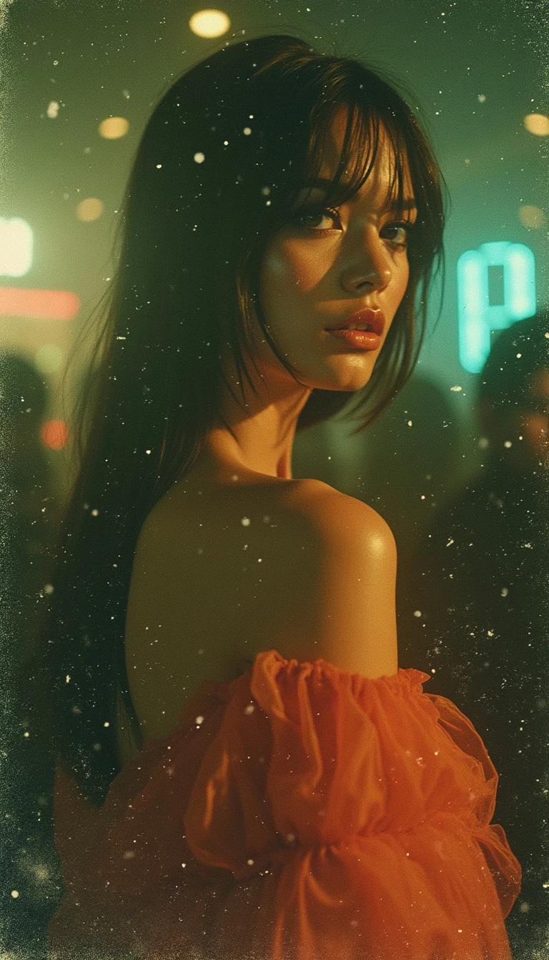 A dark, moody Polaroid with a pointillism-inspired texture, capturing a model in a dramatic pose at New York Fashion Week. The fall aesthetic is reflected in the color scheme of burnt orange, dark green, and muted golds. The dizzy effect comes from the overlay of shifting reflections from a mirror glass, giving the image a fragmented, surreal feel. Fine grain enhances the gritty, candid look, while neon accents glow softly in the background, adding contrast. The blurred bokeh lights and dramatic, high-contrast lighting bring an edgy, avant-garde energy to the shot.