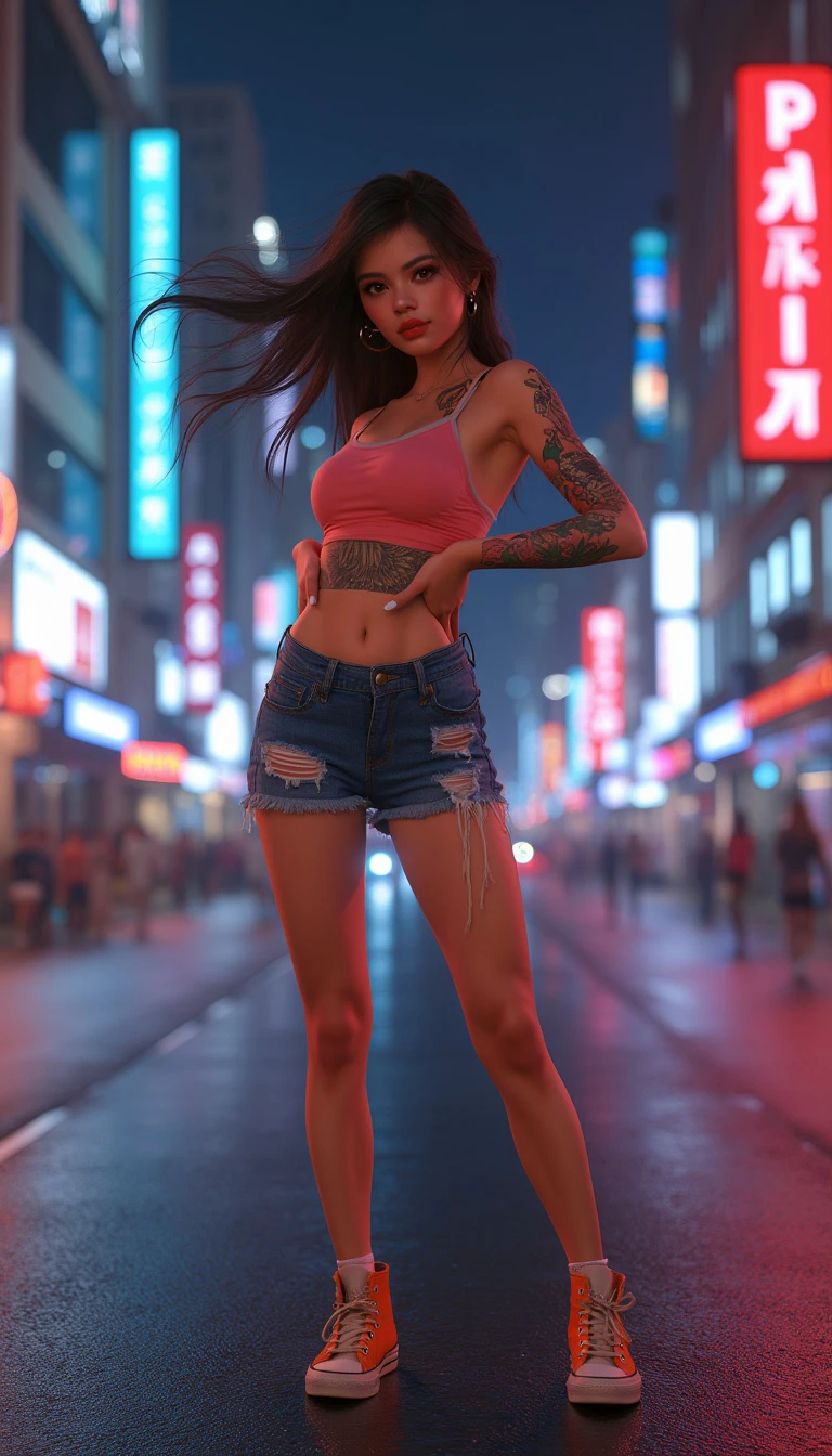 (8k, RAW photo, best quality, masterpiece:1.2), (realistic, photo-realistic:1.37), best quality, ultra high res, photon mapping, radiosity, physically-based rendering, 1girl, (MILF body type:1.3), ((ripped short jeans)), ((colorful sneakers)), ((vibrant tank top)), model-like pose, (brazilian girl anitta), (aegyo sal:1), looking at viewer, posing, (full body), large breasts, busty, toned body, wide hips, large butt, cityscape, night, (bokeh:1.4), ((wink)), ((hair blown by air)), sharp focus, subsurface scattering, f2, 35mm, perfect anatomy, maximum detail, hyper realism, high detail, 8k, HDR, UHD, (photorealistic:1.2), panoramic, dslr photo, (((surreal))), trippy, shot on Fujifilm X-T4,14mm f1.8, motion blur, @WillDWilD cartoon, cgi, render, illustration, painting, drawing, octane render, (worst quality, low quality, illustration, 3d, 2d, painting, cartoons, sketch), naked, nude, tattoos, tattoo, 3D Visualization>, Render<, Quality Spectrum=, Bad Render<, Unfavorable Proportions=, Watermark=, Compression=, Scientific Limitation=, anime eyes, unaestheticXL_hk1, @WillDWilD