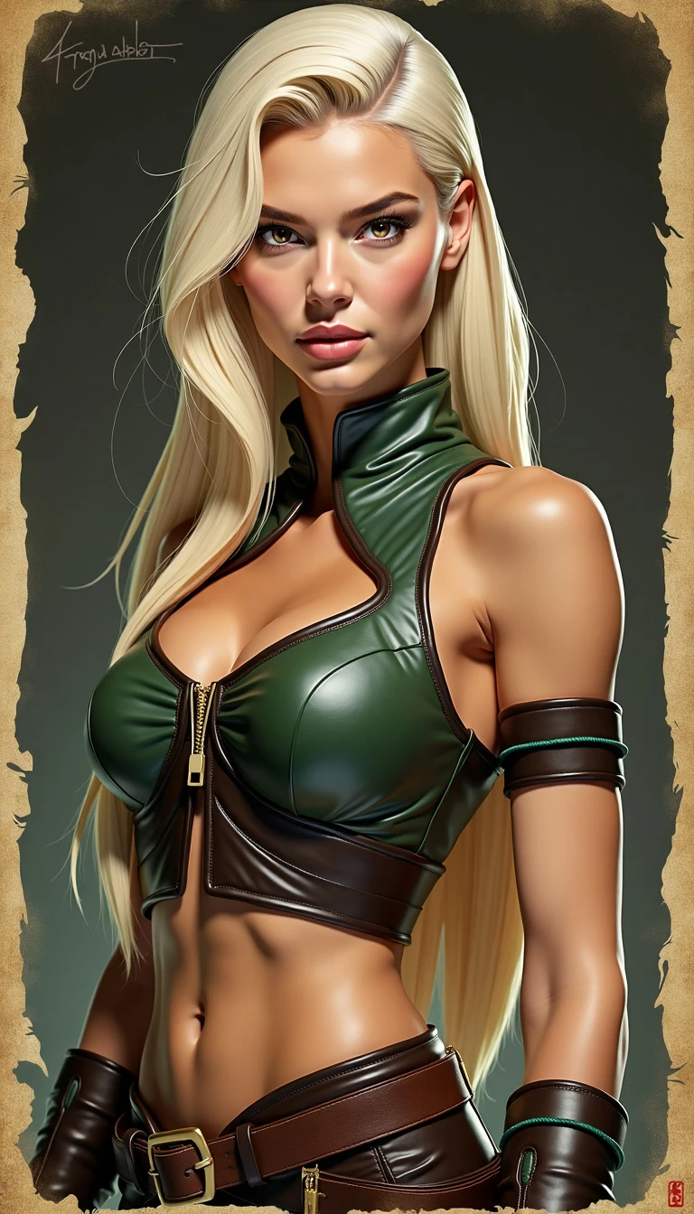 Style of Tomma Abts, Callisto as portrayed by Hudson Leick, her hair is platinum blonde, her eyes are light brown, she is wearing her leather outfit from Xena: Warrior Princess, there is a vintage border around the image
