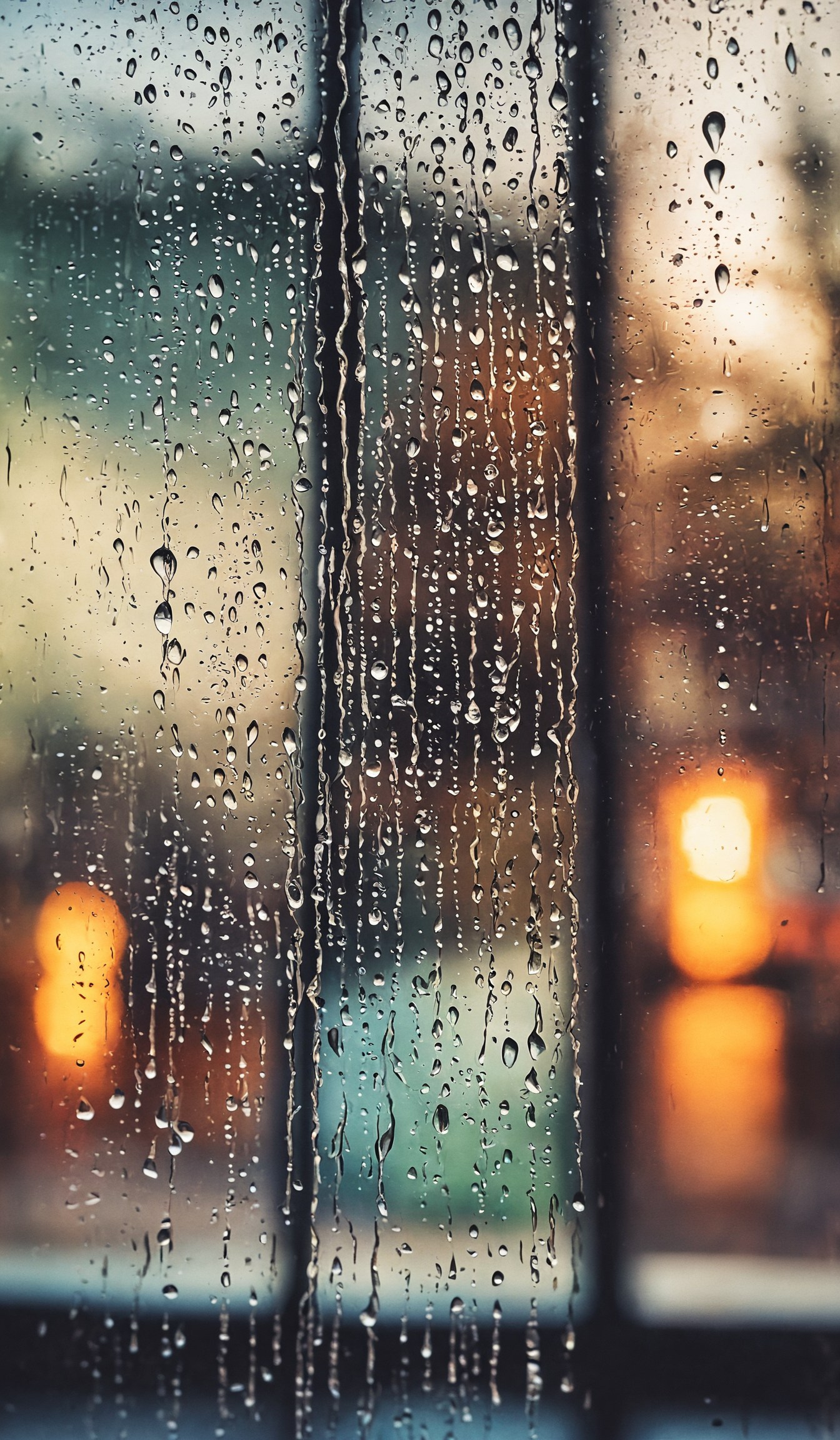 Closeup through window of rainy day with water dripping down glass against blurred colorful background. Dramatic unusual scene. Beauty world. Retro filter and vintage style. Instagram toning effect, breathtaking photograph.