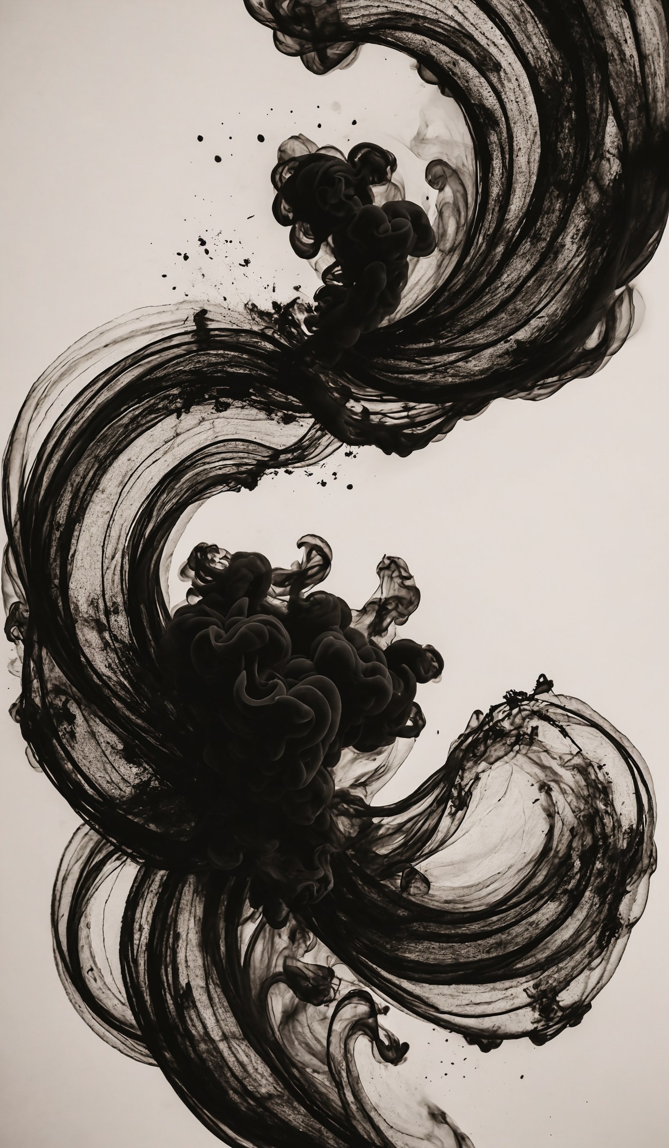 Abstract backdrop with stains of black incense smoke in concentric swirls against white background. Dramatic unusual scene. Beauty world. Retro filter and vintage style. Instagram toning effect, breathtaking photograph.