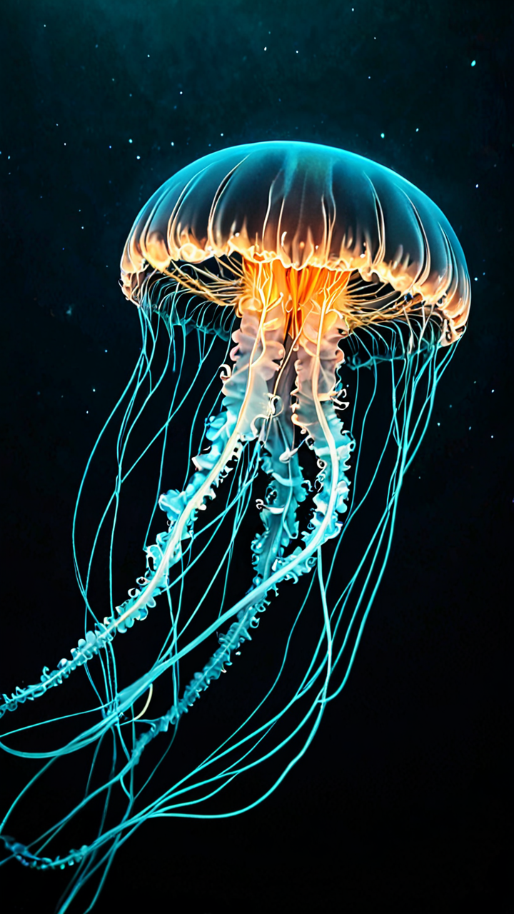 A single light blue jellyfish floats gracefully in the pitch-black depths of the ocean, its delicate long tentacles trailing behind it like an intricate lace. A dramatic and unusual scene. A world of beauty. Vintage style with retro filter. Toning effects for Instagram, breathtaking photos.<lora:novuschroma70 style_:1>