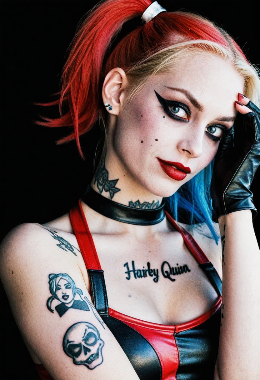 1girl, ❤️, harley quinn, ♦-tattoo, 😅 expression, †edgy† outfit <lora:acc\dmd2_sdxl_4step_lora>