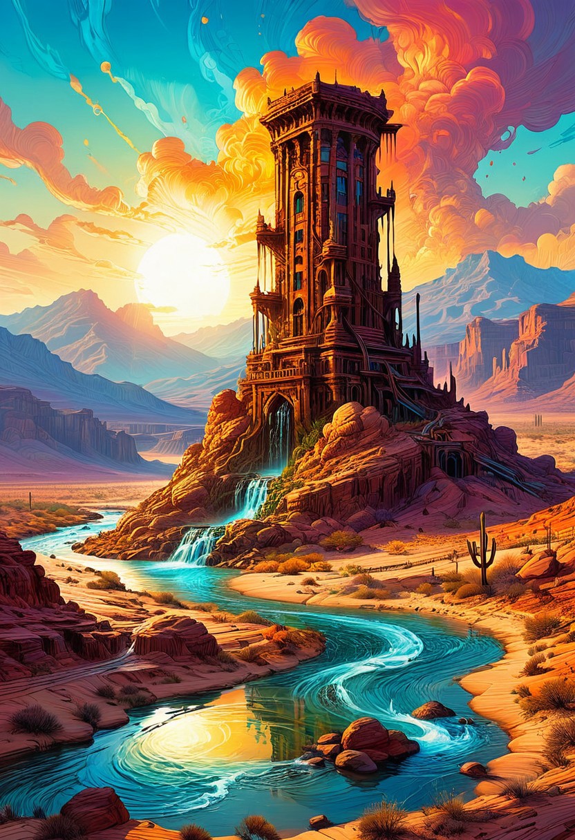 splash art, digital painting, flat 2d illustration, a shower in a desert, intricate details, natural lighting, volumetric lighting maximalist. intricately detailed, mountains, sunset, river, lines and vibrant splashes of color. the surreal figure appears to be composed of translucent energy, a tower in a desert, landscape by james cameron <lora:InkArtXL_1.2:0.4> <lora:FaeTastic:0.35> . incredibly lifelike, high contrast, well defined .