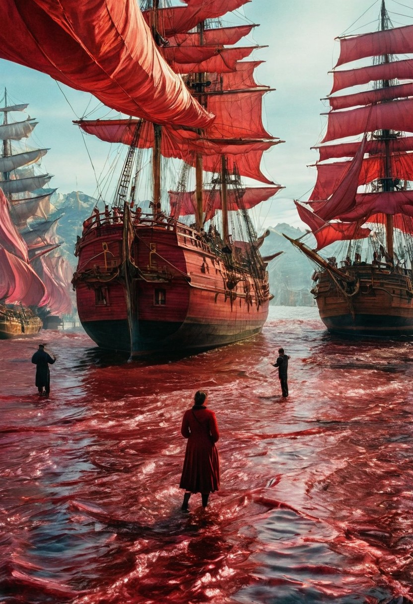 A lone figure, races mingling, and towering masted ships. A bold color palette of rich reds, fantastical, film photography style, light grain, ,Heather Theurer, The sky above ripples like water, distorting the sense of up and down. In this bizarre landscape, one altered element can send the entire scene careening into chaos.