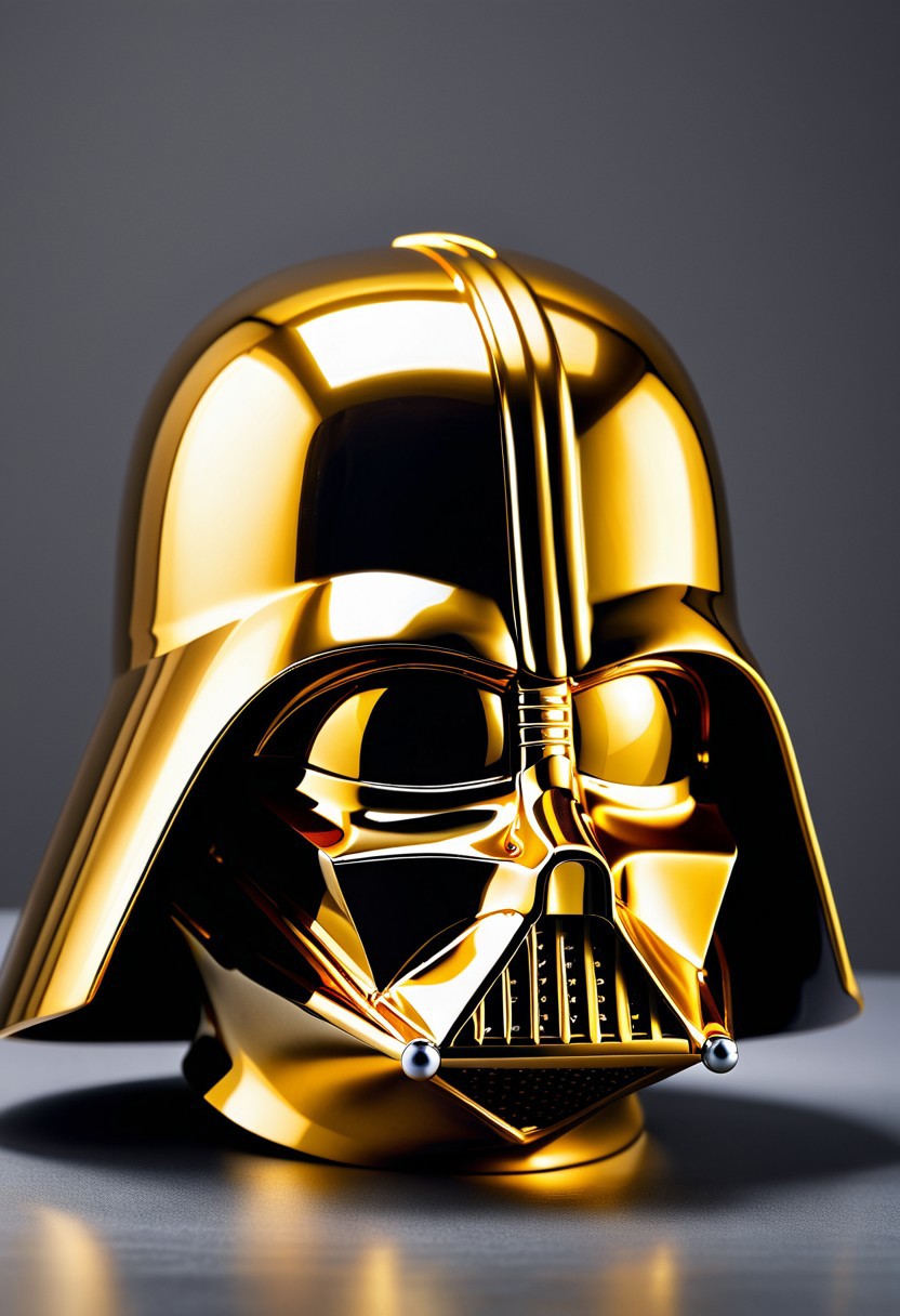 Surrealist, Darth Vader helmet made of solid gold, dripping with melting gold, intricate, elegant, photorealistic, studio lighting, gray background