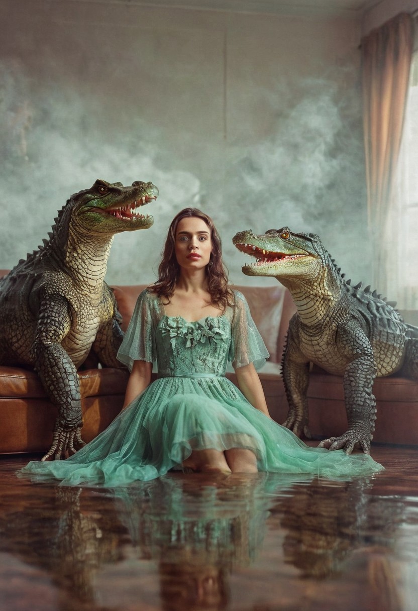 their peaks veiled photography, high detail, hyperrealistic, white wall background, three people, friendly crocodile in a dress, studio lighting in mist. mixed media, surrealism, great lighting, A surreal landscape highly detailed . Olivia De Berardinis style, alberto Vargas style, Ernest looking trapped in an optical illusion of reflections and refractions colorful , professional photography, natural lighting, volumetric lighting maximalist. intricately detailed, complex, elegant, expansive, fantastical, film photography style, heavy grain