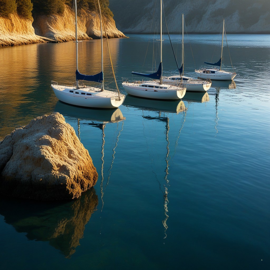"Sailboats at Anchor" – A serene cove cradles a group of sailboats, their sleek hulls shining with a mirror-like reflection on the glassy water. Don Eddy’s mastery of reflective surfaces captures every nuance of light bouncing off the polished boats, while Ralph Goings encapsulates the stillness in the water, making it appear almost motionless. Roberto Bernardi’s intricate touch brings the play of light and shadow on the water’s surface into vivid focus, creating a breathtaking illusion of the sky being perfectly mirrored below, with every ripple and subtle change in the atmosphere meticulously detailed. midjourneyv6.1, detailmaximizer, aidmaMJ6.1, flux-style