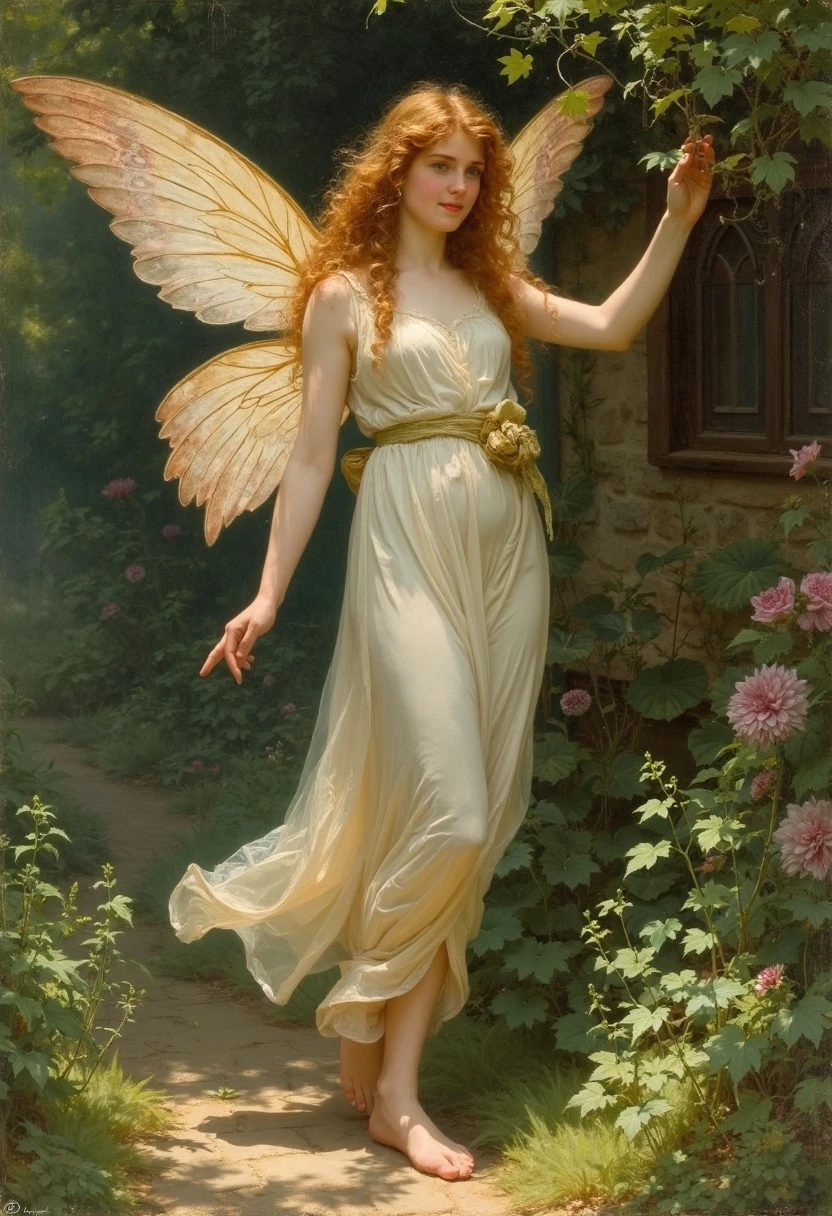 Style of Edwin Austin Abbey, winged faerie, forward facing, she has an elaborate hairstyle, she is beautiful and wears a sundress that reaches her ankles, she is barefoot and standing near her home, she has bright eyes
