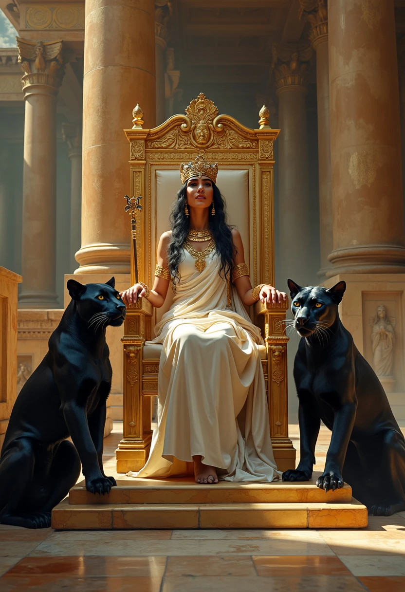 A masterpiece work by Thomas Benjamin Kennington in the style of the artist, queen Cleopatra seated on her grand throne within the magnificent hall of the Temple of Solomon. flanked by two majestic black panthers , The scene is cinematic, queen is portrayed as a regal figure with a crown, a flowing robe, and a wise, serene expression, holding a scepter. symbolizing wisdom and authority. The throne is made of ivory and gold, elevated on a platform with six steps. In the background, grand pillars and detailed carvings of lions, cherubim, and palm trees fill the temple, reflecting the opulence and craftsmanship of the era. The overall atmosphere is majestic and awe-inspiring.”