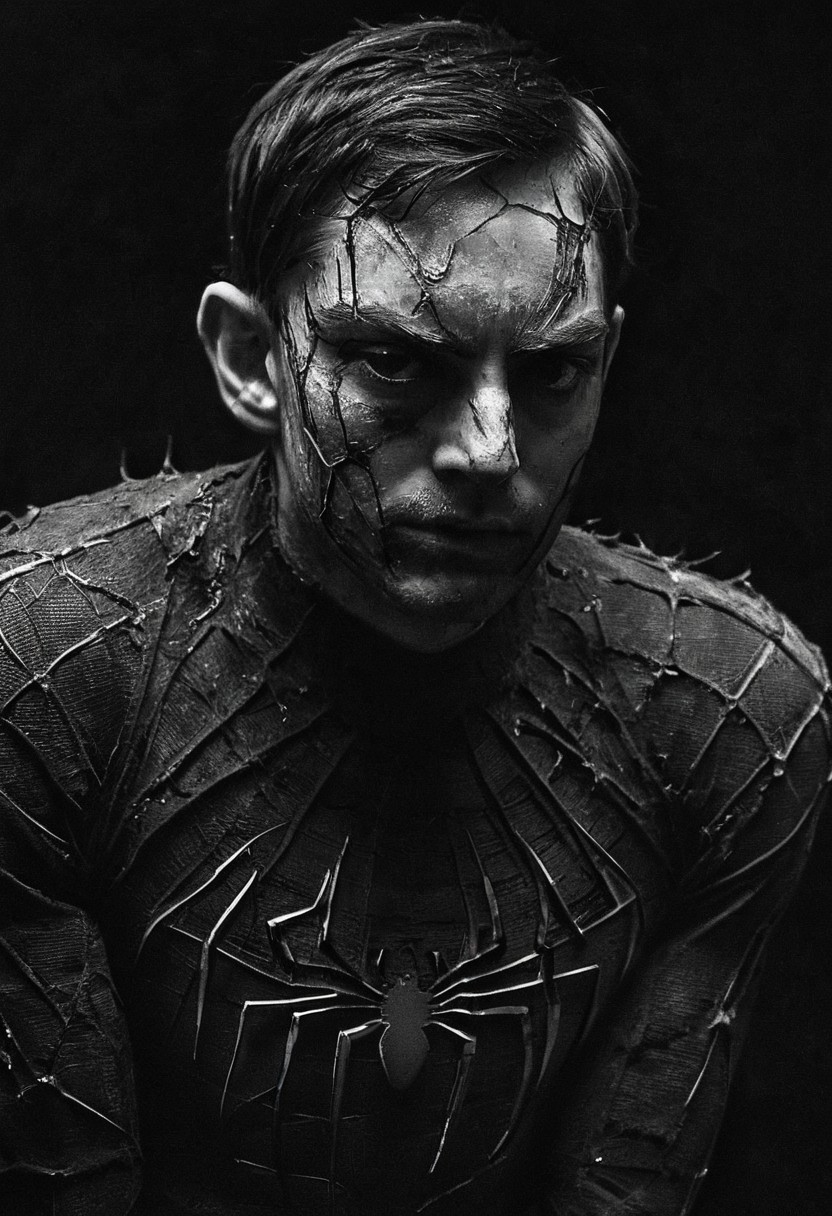 high-contrast monochrome palette, Tobey Maguire in Spider-man suit, (skin pores:0.5), (skin oils:0.3), black background, black-and-white, shadow over eyes, cool looking, portrait, side view, ripped suit, blood dark eyes, ng_deepnegative_v1_75t, injury, wounds, blood, broken, suffering, torn Spider-man's mask