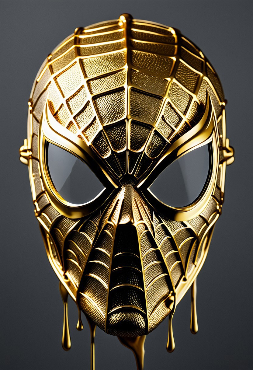 Surrealist, Spider-man Mask made of solid gold, dripping with melting gold, intricate, elegant, photorealistic, studio lighting, grey background