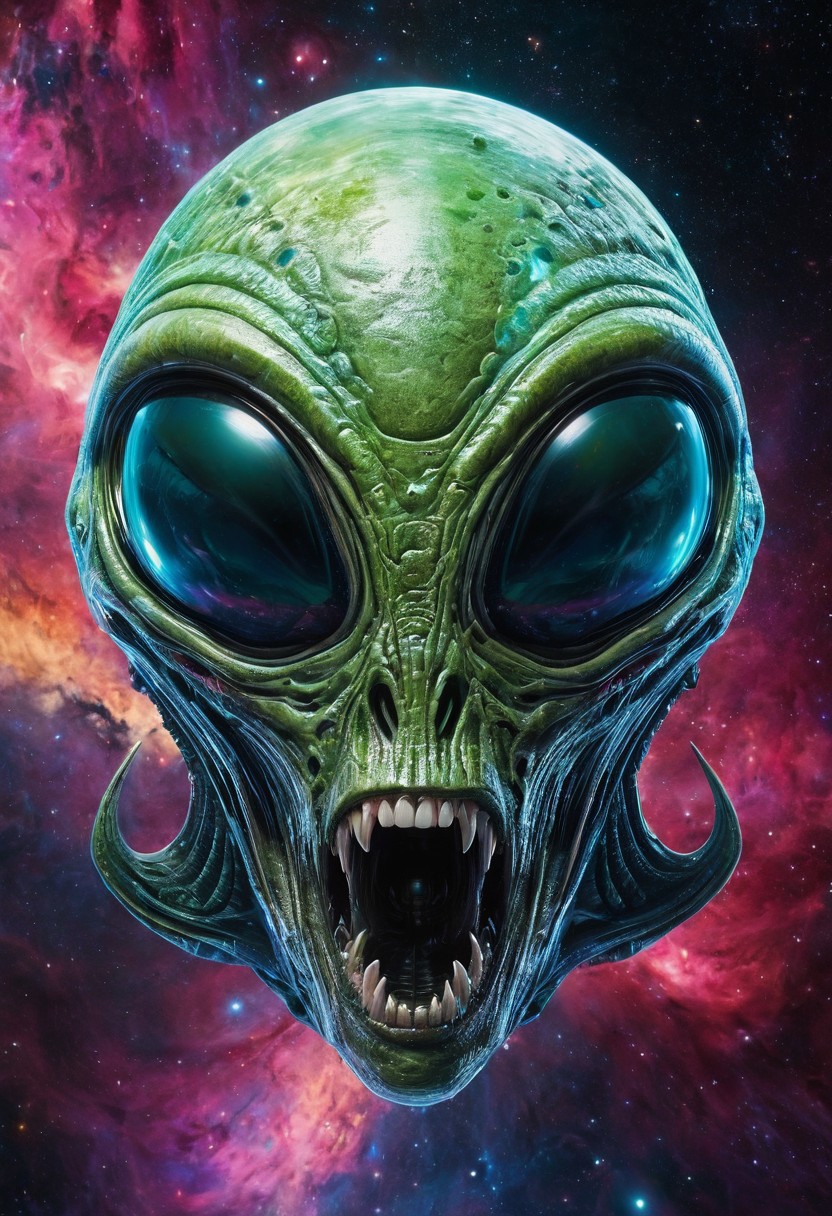 Vibrant fantasy artwork. Medium shot. A alien head that is floating in space that is resembles a huge spaceship