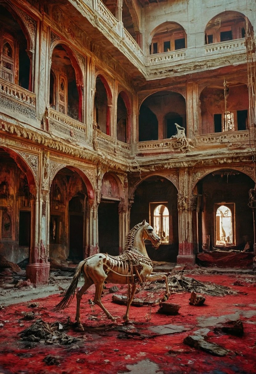 one vampire skeleton on a horse still, an ancient temple grave long cape stars death many corpses skeletons on the floor, races minglingto a brutalist house in marrakech, and towering masted ships. A bold color palette of rich reds, fantastical, film design, Leica smoldering accent and (shiny gold color scheme:1.02). (miniature,diorama,no_realistic photography style), light grain, In this bizarre landscape, one altered element can send the entire scene careening into chaos.