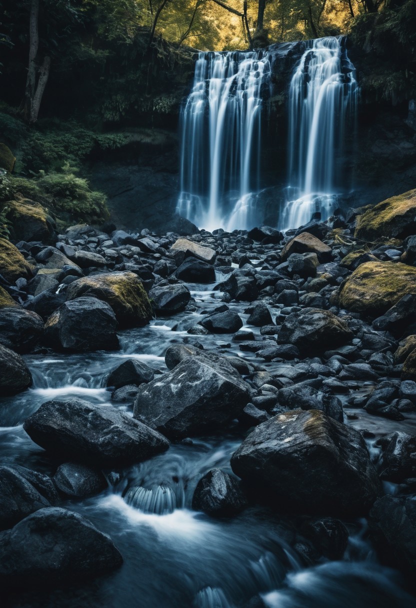 black elements surrounded by gravel and waterfalls in dark blue tones, high resolution photography, professional color grading, soft shadows, no contrast, clean sharp focus, bokeh background, natural lighting, wide angle shot