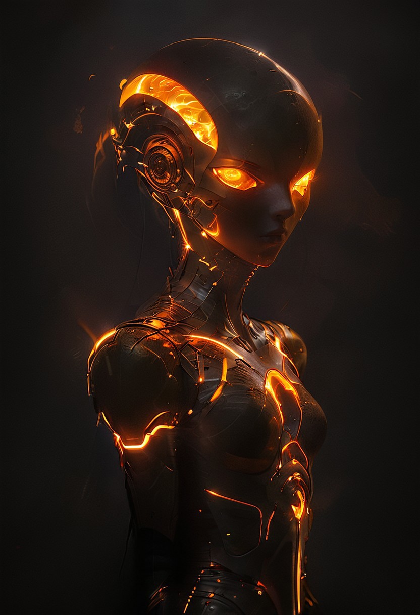 A dark sorceress in gothic armor, her face is a glowing orange crystal, light swirling inside, she holds a staff with a similar glowing orb, wearing a black flowing cloak, intricate armor with glowing cracks on her chest, the setting is dim and atmospheric, soft light filtering through the background, creating an eerie magical vibe, the scene exudes dark fantasy and mysterious sorcery glowneon, glowing, sparks, lightning, dark, chiaroscuro, low-key