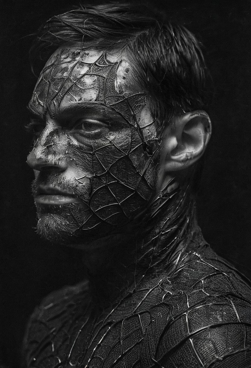 high-contrast monochrome palette, Tobey Maguire in Spider-man suit, (skin pores:0.5), (skin oils:0.3), black background, black-and-white, shadow over eyes, cool looking, portrait, side view, ripped suit, blood dark eyes, ng_deepnegative_v1_75t, injury, wounds, blood, broken, suffering, torn Spider-man's mask