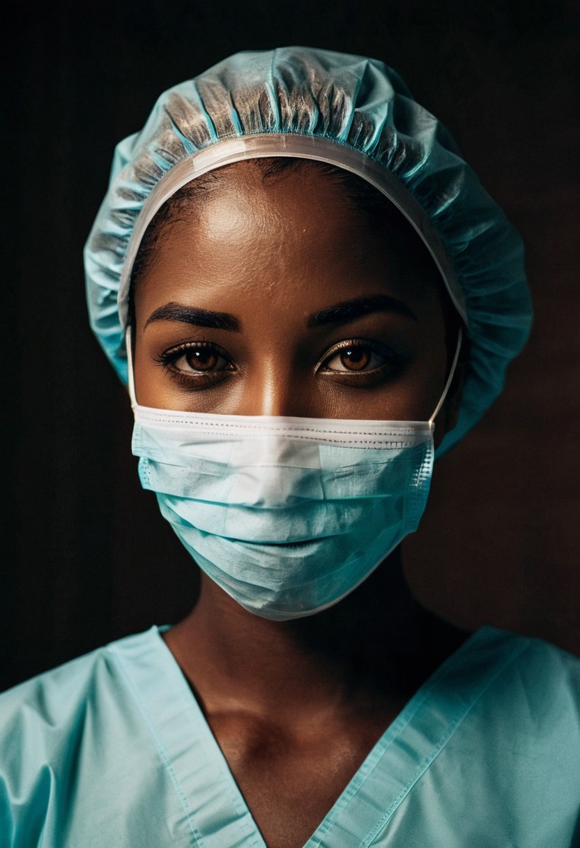A female black surgeon in surgical outfit, (Ghanian), (brown skin:2), surgical mask, surgical cap and surgical gloves, (holding a golden scalpel), Detailed picture, very high resolution, (in an operating room), surgical outfit, skin tone style, Stable-Yogis-Rembrandt-lighting-1.5x , easynegative, Stable-Yogis-EtherealBeauty-1.5x, brown eyes, perfecteyes, dim light, low light, dramatic light, partially covered in shadow, Low-key lighting Style, film, grain, bokeh,