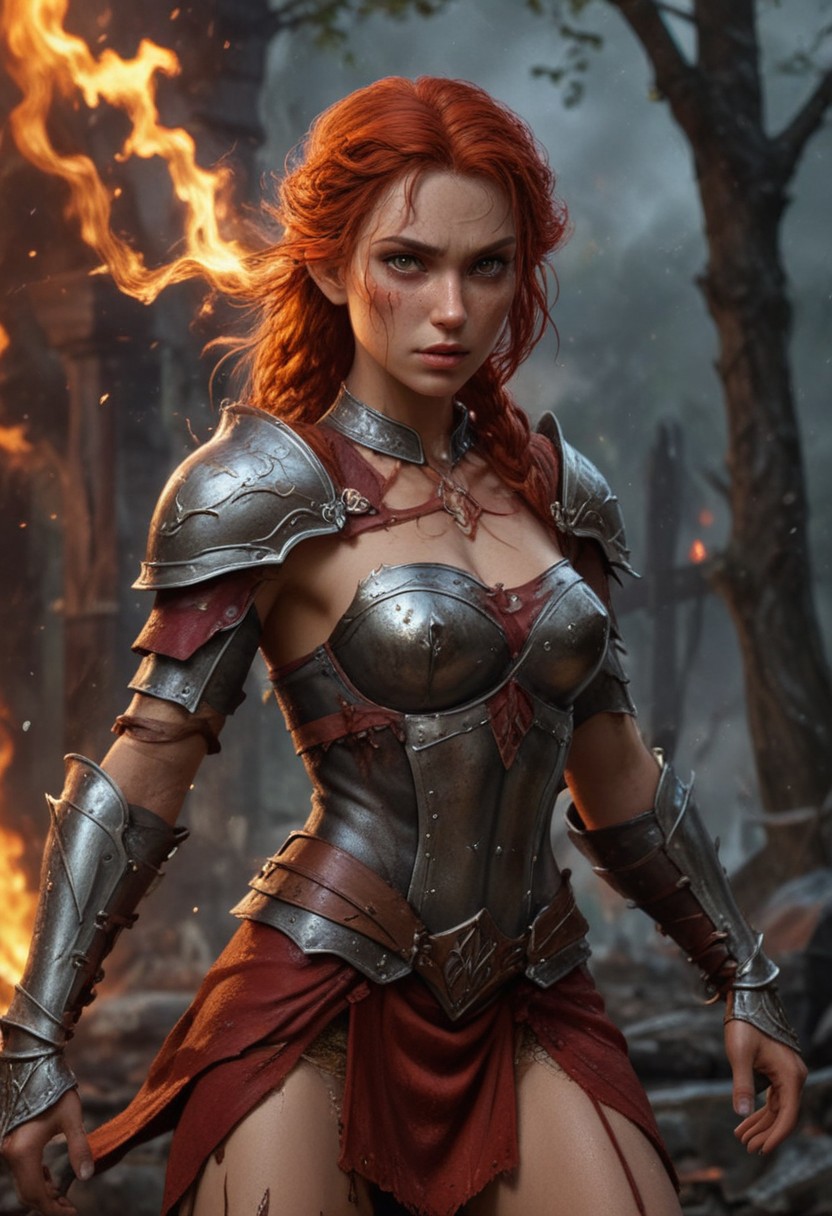 High resolution ultra-realistic of Beautiful Warrior Elf girl, 8k, capturing the intensity of the moment, cinematic lighting, standing on a bloody and stormy battlefield in bloody battle, wavy red hair, realistic dirty pale face, realistic dark brown eyes, beautiful hourglass figure, burning in a medieval Town, intricately designed iron and silver armor, red mini skirt, LOTR Aesthetic, perfect athletic figure, beautiful Warrior elf girl, fire, ultra realistic, cinematic style, vigorous and seductive, athletic figure, dark fantasy, dramatic lighting, wet and sweaty skin, dirty skin, athletic figure, dark fantasy, dramatic lighting, Greg Rutkowski style,, Warrior Elf girl on in iron armor, hyper-detailed, hyper-realistic, bright colours, Attractive 21 old years girl, Attractive, beautiful firm Breasts, sharp focus, digital painting, Photograph Taken on Nikon D750, Alphonse Mucha, 8K, athletic figure, Hyperdetailed, hyperrealism, Attractive, Attractive bust girl, asymmetric balance