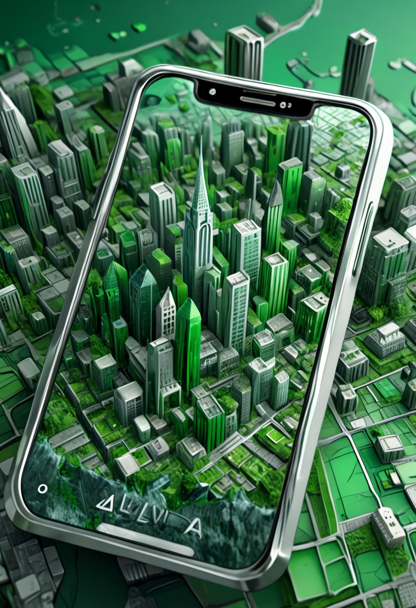 a Scandinavian 3D cityscape growing from a mobile phone, highly fantasy, green colors, Silver scenery, Lewi Guilherme, amazing depth, epic art