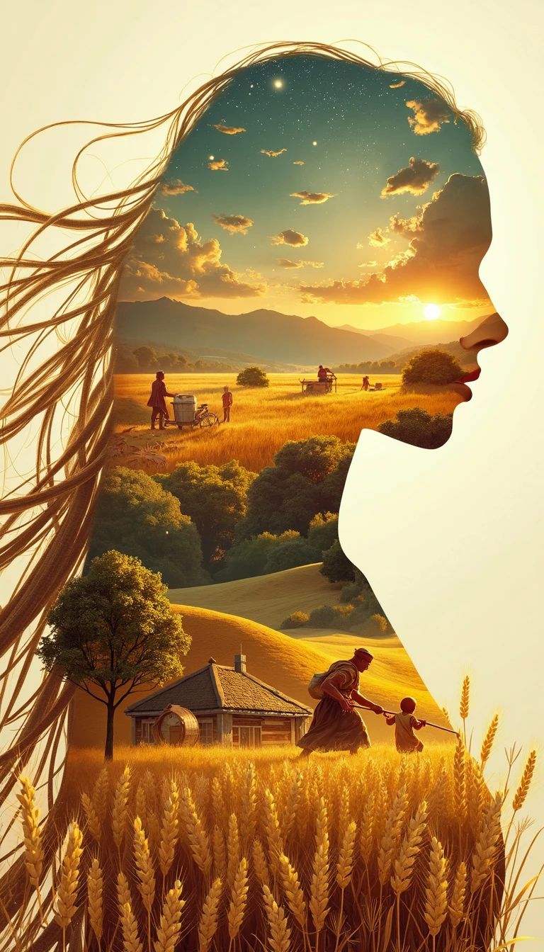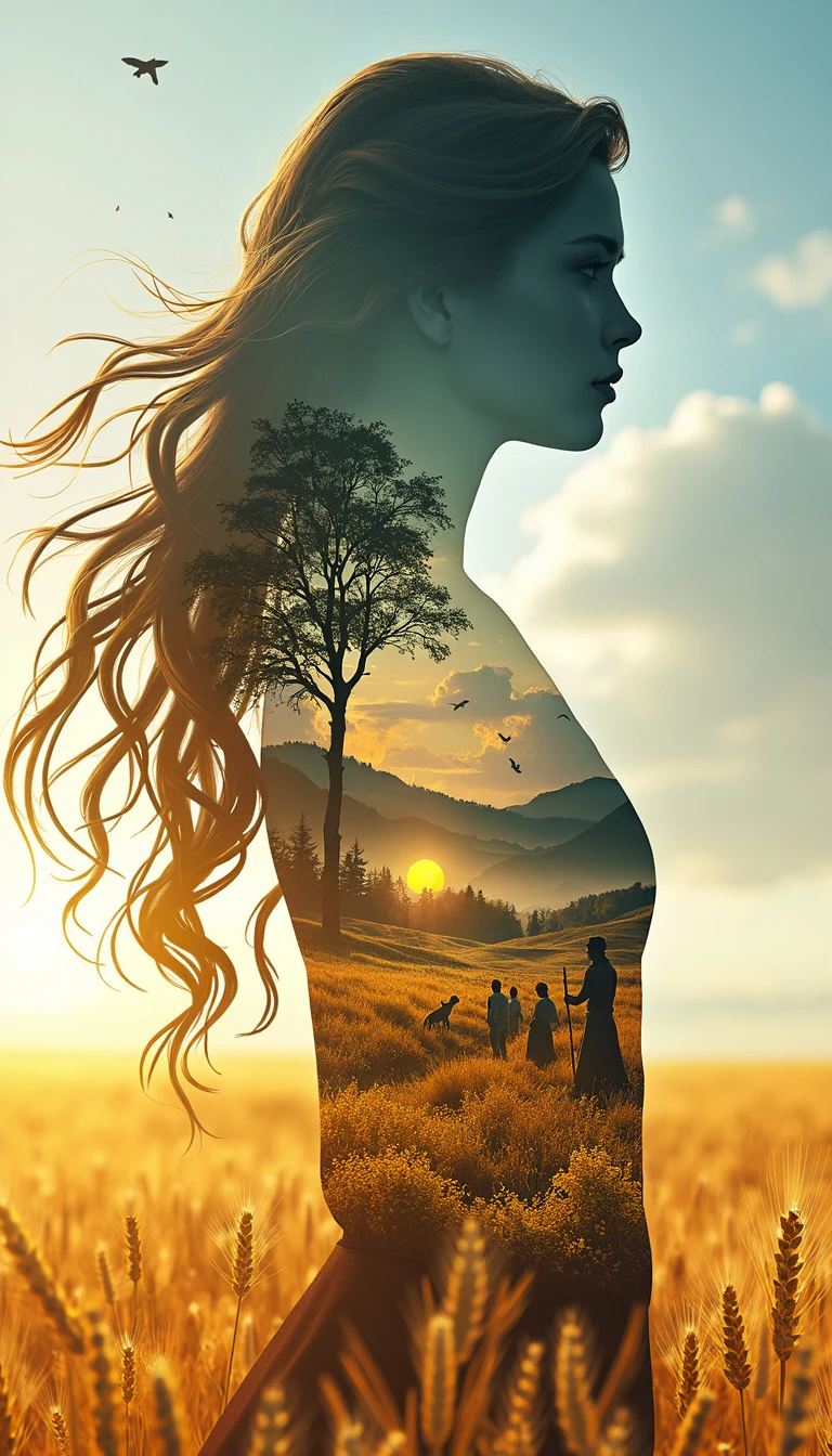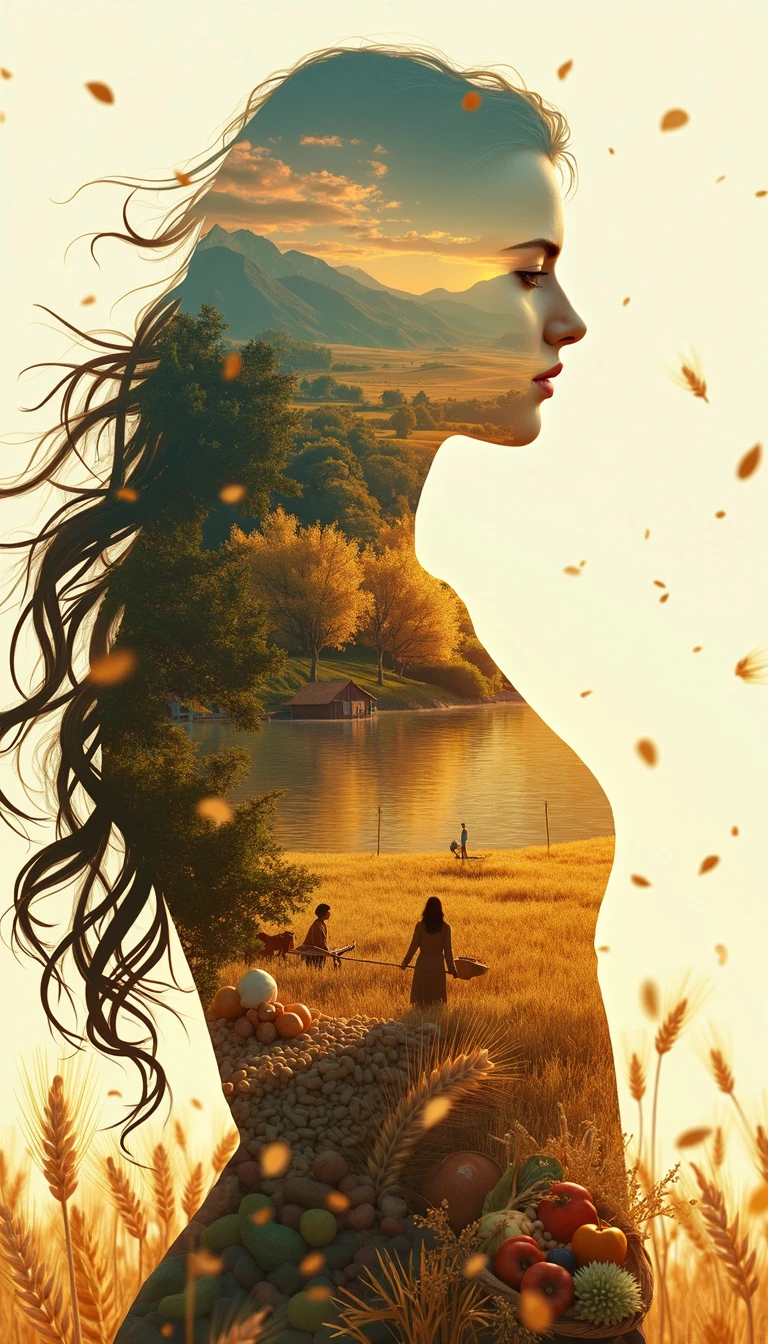 Design a graceful 8K resolution 3D double exposure artwork featuring a silhouette of Sif, the Norse goddess associated with earth, fertility, and grain, set against a backdrop of golden fields and lush harvest landscapes. Within Sif's form, incorporate: Her flowing hair made of golden wheat, symbolizing fertility and abundance A cornucopia overflowing with grains and fruits Flowing robes that merge seamlessly with the bountiful landscapes Inside Sif's silhouette, depict scenes of agriculture, harvest, and the nurturing of the earth: Farmers tending to golden wheat fields under her benevolent gaze Bountiful harvests being gathered and celebrated in vibrant festivals Flourishing orchards and gardens symbolizing prosperity and growth Use a color palette that blends: Golden yellows and rich browns representing harvest and fertility Lush greens and earthy tones symbolizing nature and growth Soft oranges and reds for warmth and abundance The overall composition should convey abundance and nurturing, emphasizing Sif's role as the goddess who ensures the earth's fertility and the prosperity of its people. Incorporate artistic styles inspired by Norse folklore illustrations and pastoral landscapes, with warm, radiant lighting effects to enhance the bountiful and serene atmosphere. Subtly integrate grain motifs and earth symbols throughout the artwork, symbolizing fertility, growth, and the nurturing aspects of Sif.