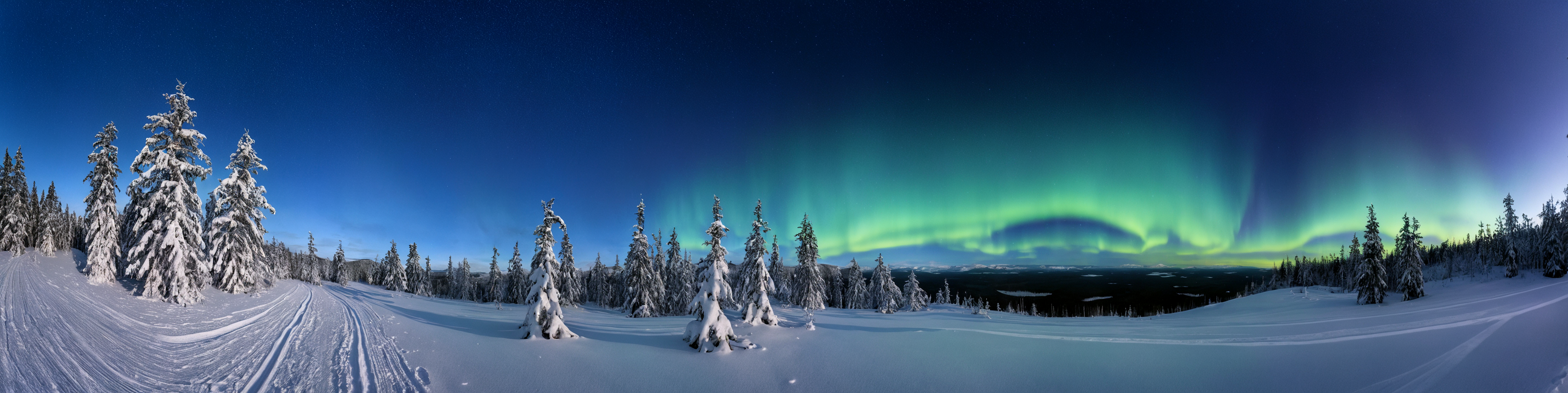 A 360 degree panorama shot of a quiet snowy Norwegian forest at nautical twilight, with a dark-blue sky glow from the fading light, ultra_detailed, 8k, serene and peaceful, winter calm, faint wispy wavy ribbons and bands of aurora can be seen low on the horizon, Stable_Yogis_PDXL_Positives