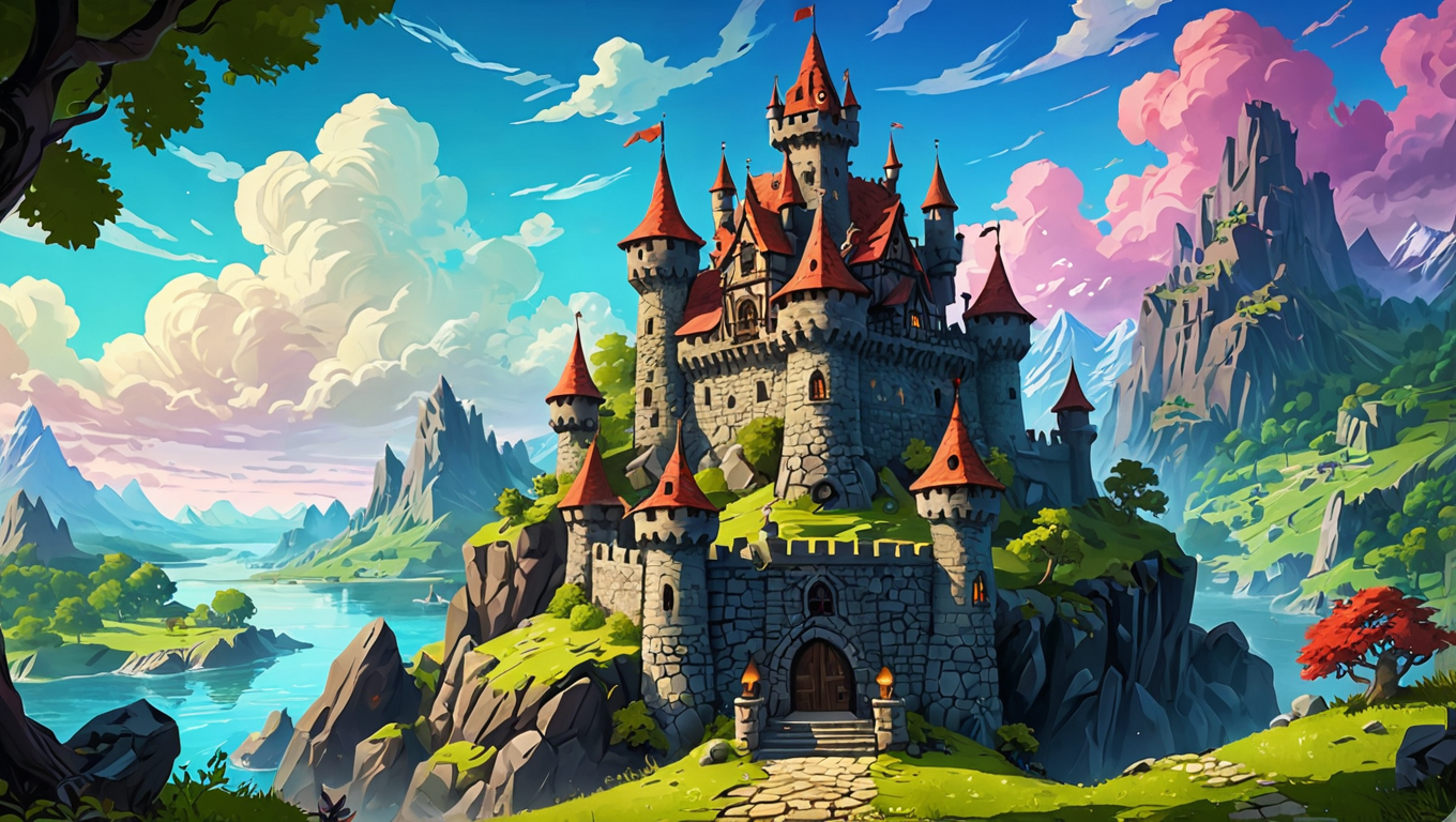 Role-playing game (RPG) style fantasy A monster castle, style of Ed Binkley . Detailed, vibrant, immersive, reminiscent of high fantasy RPG games