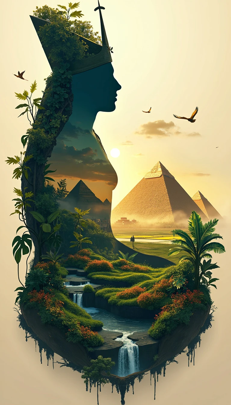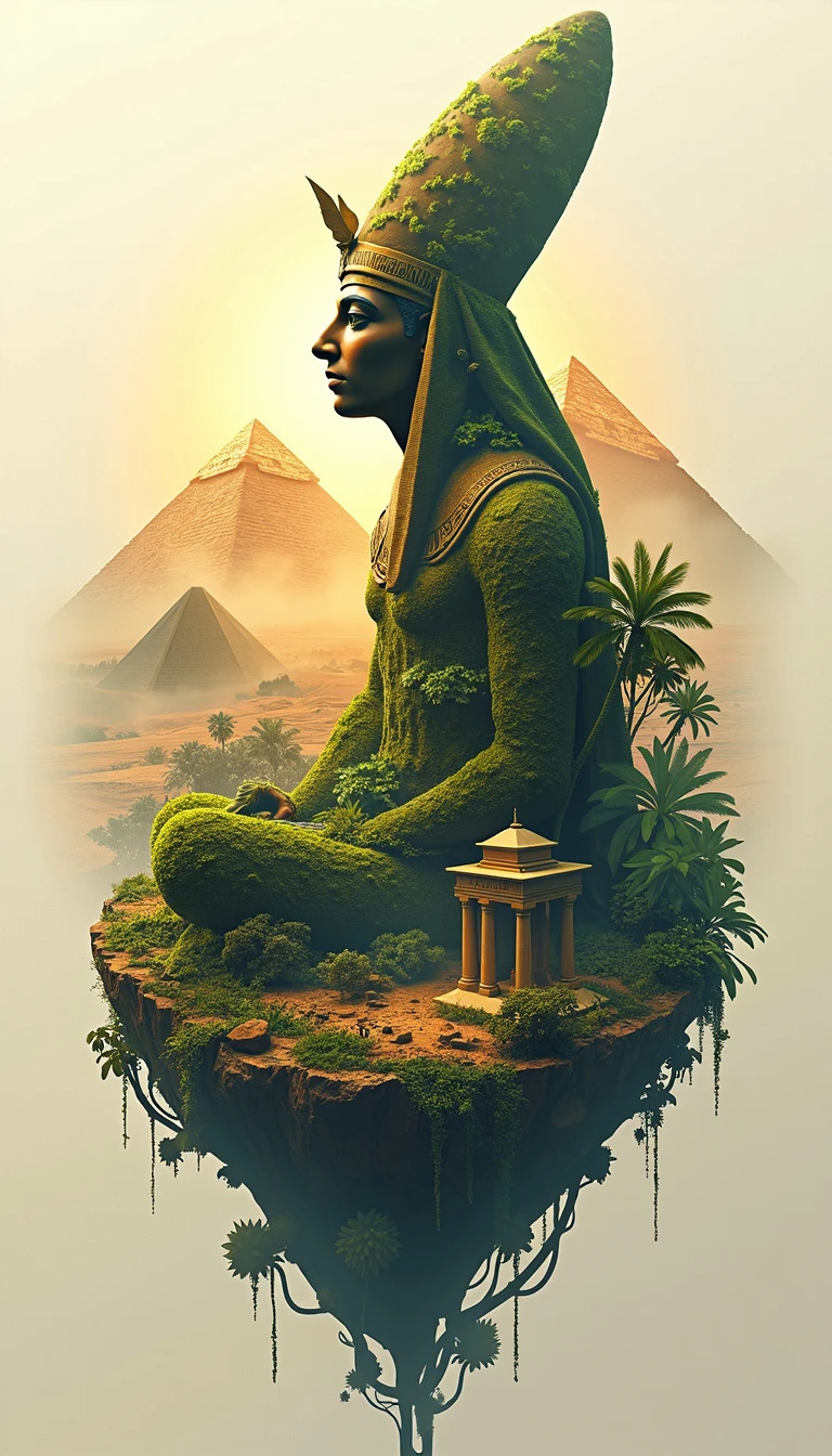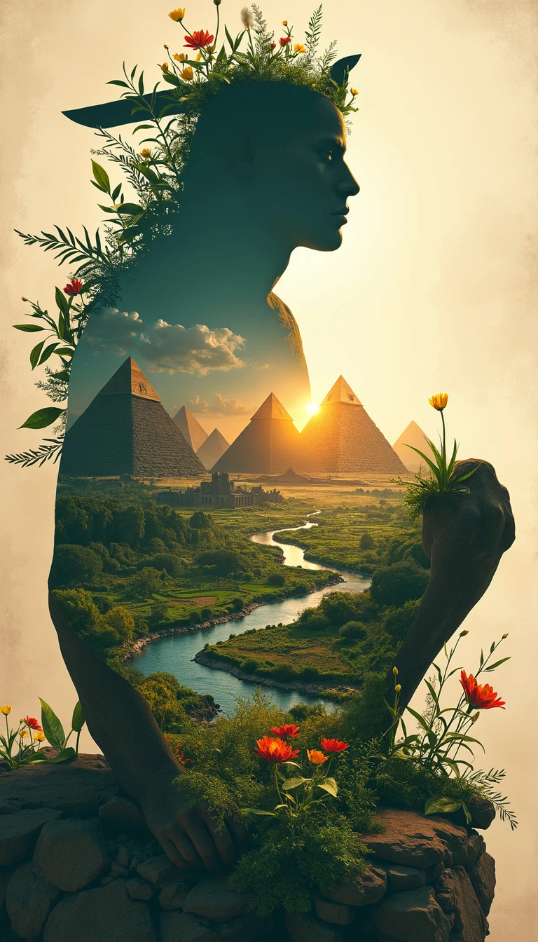 Design a grounded 8K resolution 3D double exposure artwork featuring a silhouette of Geb, the Egyptian god of the earth, set against a backdrop of fertile fields and towering pyramids. Within Geb's form, incorporate: His seated, robust figure symbolizing the stability and fertility of the earth A crown adorned with green foliage, representing vegetation and growth Flowing robes that blend into lush landscapes and monumental architecture Inside Geb's silhouette, depict scenes of agricultural abundance, architectural grandeur, and the nurturing of life: Farmers cultivating rich, fertile fields along the Nile Construction of grand pyramids and temples, symbolizing human achievement and divine favor Flourishing flora and fauna thriving under Geb's influence Use a color palette that blends: Vibrant greens and earthy browns representing fertility and the earth Rich golds and yellows symbolizing abundance and divinity Deep blues and blacks for the night sky and stability The overall composition should convey abundance and stability, emphasizing Geb's role as the embodiment of the earth and the sustainer of life. Incorporate artistic styles inspired by ancient Egyptian art and modern landscape designs, with soft, radiant lighting effects to enhance the fertile and majestic atmosphere. Subtly integrate floral motifs and pyramid symbols throughout the artwork, symbolizing growth, stability, and architectural grandeur.