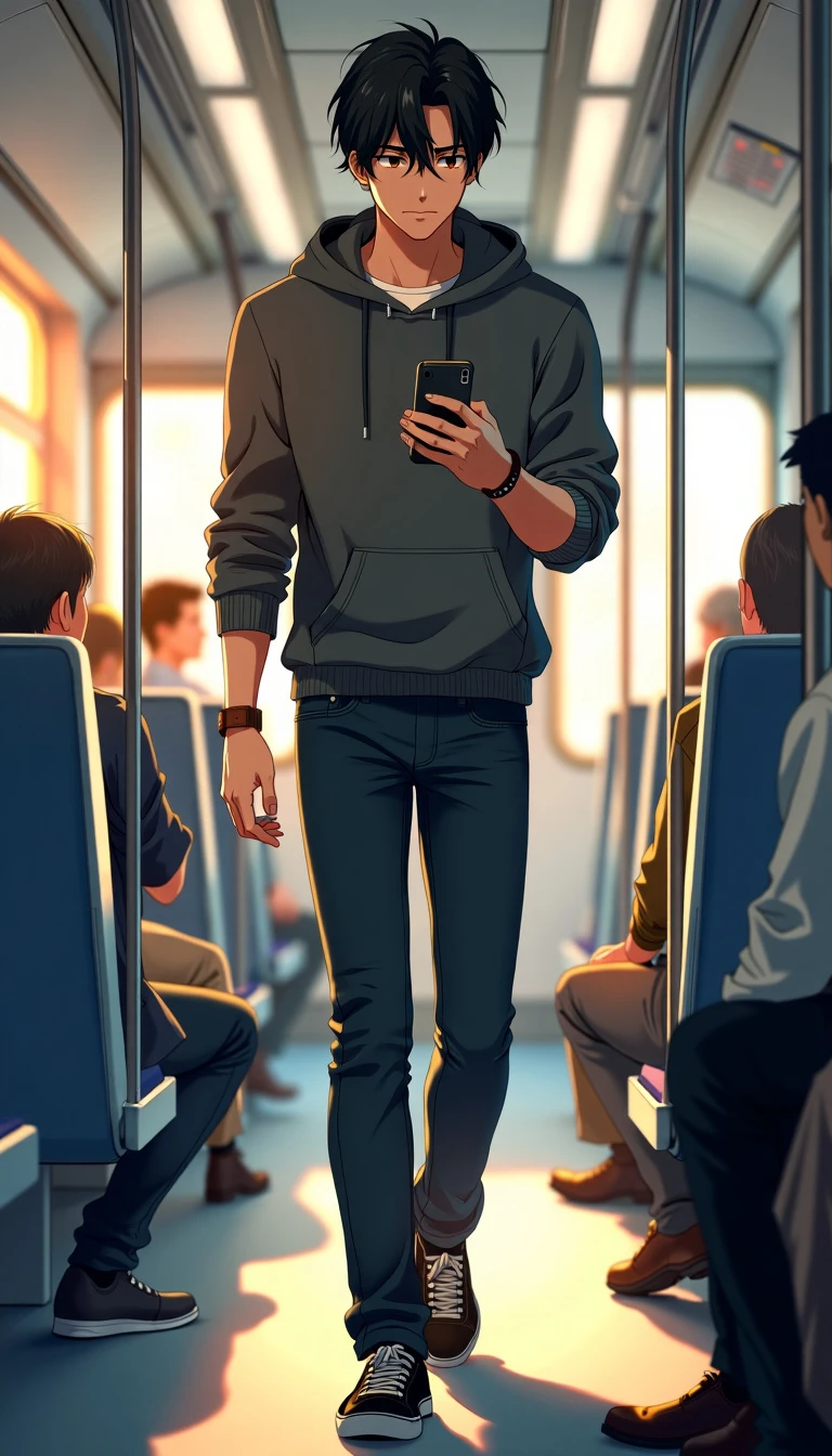 Modern Anime Style Wide Shot – Yuji Walking Down the Aisle of the train. Yuji glances at his phone, distracted as he moves down the aisle, his face carrying a subtle expression of impatience. It’s a busy morning on the train, sunlight filtering through the windows, casting a golden hue across the scene. The seats are muted shades of blue and gray, slightly worn but clean. Yuji, standing at 5'11" with a lean and athletic build, walks down the aisle. His skin is lightly tanned, and his sharp, well-defined facial features—straight nose, strong jawline with slight stubble, and thin lips—are highlighted by the train's ambient light. His eyes, narrow and sharp, are a deep coffee-brown. His medium-length, slightly tousled jet black hair falls just above his eyebrows, a few strands brushing his forehead. He wears a charcoal-gray hoodie, with the sleeves pushed up just below his elbows, paired with dark blue slim-fit jeans and black sneakers with white soles. A dark mahogany brown leather wristband with a simple silver buckle is on his right wrist.