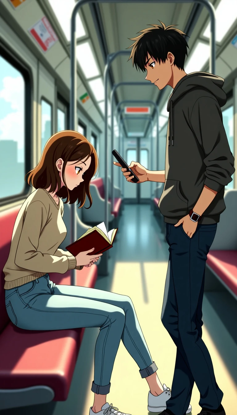 Modern Anime Style Medium Shot – Aiko is sitting in her seat and reading her book, Yuji is walking down the train aisle looking into his phone. The train jolts suddenly, and Yuji, lost in thought, stumbles and bumps into Aiko. Aiko, startled, drops her book. Aiko is standing at 5'4" with a petite and slender frame, has fair skin with a rosy undertone, delicate facial features, and almond-shaped hazel eyes that shift between brown and green in the light. She wears a cream-colored sweater hanging slightly off her shoulder, paired with high-waisted, light-wash denim jeans and white sneakers. Her chestnut brown, shoulder-length wavy hair catches the sunlight, highlighting its golden streaks. Yuji is standing at 5'11" with a lean and athletic build, walks down the aisle. His skin is lightly tanned, and his sharp, well-defined facial features—straight nose, strong jawline with slight stubble, and thin lips—are highlighted by the train's ambient light. His eyes, narrow and sharp, are a deep coffee-brown. His medium-length, slightly tousled jet black hair falls just above his eyebrows, a few strands brushing his forehead. He wears a charcoal-gray hoodie, with the sleeves pushed up just below his elbows, paired with dark blue slim-fit jeans and black sneakers with white soles. A dark mahogany brown leather wristband with a simple silver buckle is on his right wrist.