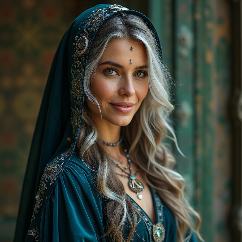 Appearance Age: She appears to be in her late 30s to early 50s, radiating both youthful vitality and the wisdom of experience. Facial Features: Eyes: Deep-set and captivating eyes in shades like emerald green or sapphire blue. They have a slight sparkle, hinting at her mystical insights and ability to see beyond the surface. Complexion: Warm and radiant skin with a natural glow, suggesting health and a serene inner spirit. Expression: A gentle, knowing smile that exudes compassion and understanding. Her expression is serene, making those around her feel at ease. Hair: Long, flowing hair that cascades down her back in soft waves or curls. It could be a rich shade of dark brown, raven black, or even silvery white. Subtle highlights in colors like violet, indigo, or silver might weave through her hair, symbolizing her connection to the mystical realm. She may incorporate small braids adorned with tiny charms or beads representing celestial bodies or mystical symbols. Attire Clothing Style: Wears a flowing dress or robe made from luxurious fabrics like velvet, silk, or chiffon in deep, rich colors such as indigo, burgundy, emerald green, or midnight blue. The garment features intricate embroidery or prints of celestial motifs—stars, moons, suns—or sacred geometric patterns, possibly accented with metallic threads in silver or gold. Sleeves are long and billowy, adding a dramatic flair to her movements. Accessories: Jewelry: Wears a statement necklace with a pendant featuring mystical symbols like a crescent moon, an ankh, a pentacle, or an all-seeing eye. Fingers adorned with rings set with gemstones like amethyst, labradorite, moonstone, or clear quartz. Layered bracelets or bangles that jingle softly, made of silver or adorned with small charms and crystals. Headpiece: May wear a delicate circlet or headband adorned with a central gemstone resting on her forehead, or a thin chain with small dangling charms. Alternatively, a wide-brimmed hat or a hooded cloak that adds to her mysterious aura. Scarves/Shawls: Draped with a lightweight, sheer shawl or scarf with fringe edges, possibly embroidered with symbolic patterns or celestial designs, adding movement and elegance. Props Tarot Deck: Holds a beautifully crafted tarot deck with ornate, possibly hand-painted designs and gilded edges. The cards may have a unique art style, reflecting various esoteric themes. Additional Items: Might carry a small satchel or pouch made of leather or velvet, containing other divination tools like runes, crystals, a pendulum, or a scrying mirror. A candle or incense holder nearby, with smoke spiraling gracefully, enhancing the mystical atmosphere. Setting Environment: Indoor Option: Seated at a round table draped with a rich, dark velvet cloth, in a room softly lit by candles or lanterns that cast a warm, golden glow. The space is filled with shelves of ancient books, scrolls, and mystical artifacts like crystal balls, astrolabes, and ornate mirrors. Walls adorned with tapestries depicting celestial scenes, zodiac signs, or mythical landscapes. The air is scented with hints of incense, herbs, or essential oils like sandalwood, lavender, or sage. Outdoor Option: Standing in a serene forest clearing under a canopy of stars, with the full moon illuminating the scene. Surrounded by ancient trees, their branches adorned with hanging lanterns or ribbons. A gentle mist or soft rays of moonlight add a dreamlike quality to the setting. Ambiance: The atmosphere is enveloped in a subtle, ethereal glow or aura, suggesting the presence of magical energies. Small, luminescent orbs or sparkles may drift in the air around her, adding to the enchanting mood. Soft sounds of nature or distant, melodic chimes enhance the sensory experience. Body Language and Demeanor Posture: Stands or sits with an elegant, poised posture—confident yet approachable. Moves with grace and fluidity, every gesture deliberate and meaningful. Gestures: Hands move smoothly as she shuffles and lays out the tarot cards, fingers tracing patterns or symbols in the air. May touch her pendant or adjust her shawl thoughtfully while contemplating a reading. Expression: Eyes convey depth, wisdom, and empathy, making those who meet her gaze feel seen and understood. Maintains a calm and centered demeanor, with a voice that's soothing and melodic. Additional Elements Companion Creatures: A mystical animal companion may be present, such as: A wise owl perched nearby, symbolizing knowledge and intuition. A black or white cat curled up at her feet, representing mystery and independence. A small, ethereal fox or a bird like a raven or dove that adds to the mystical atmosphere. Magical Effects: Subtle magical elements might include: Softly glowing runes or symbols appearing briefly when she draws a card or makes a gesture. Gentle breezes that cause her hair or garments to sway even in a still environment. A faint halo of light or shimmering aura surrounding her, especially during moments of deep insight.