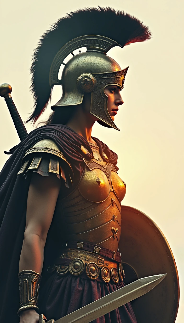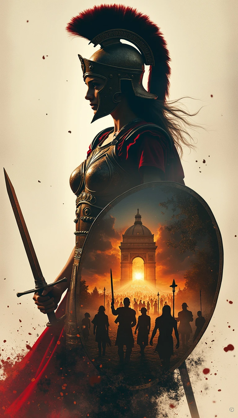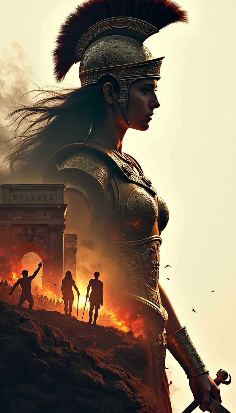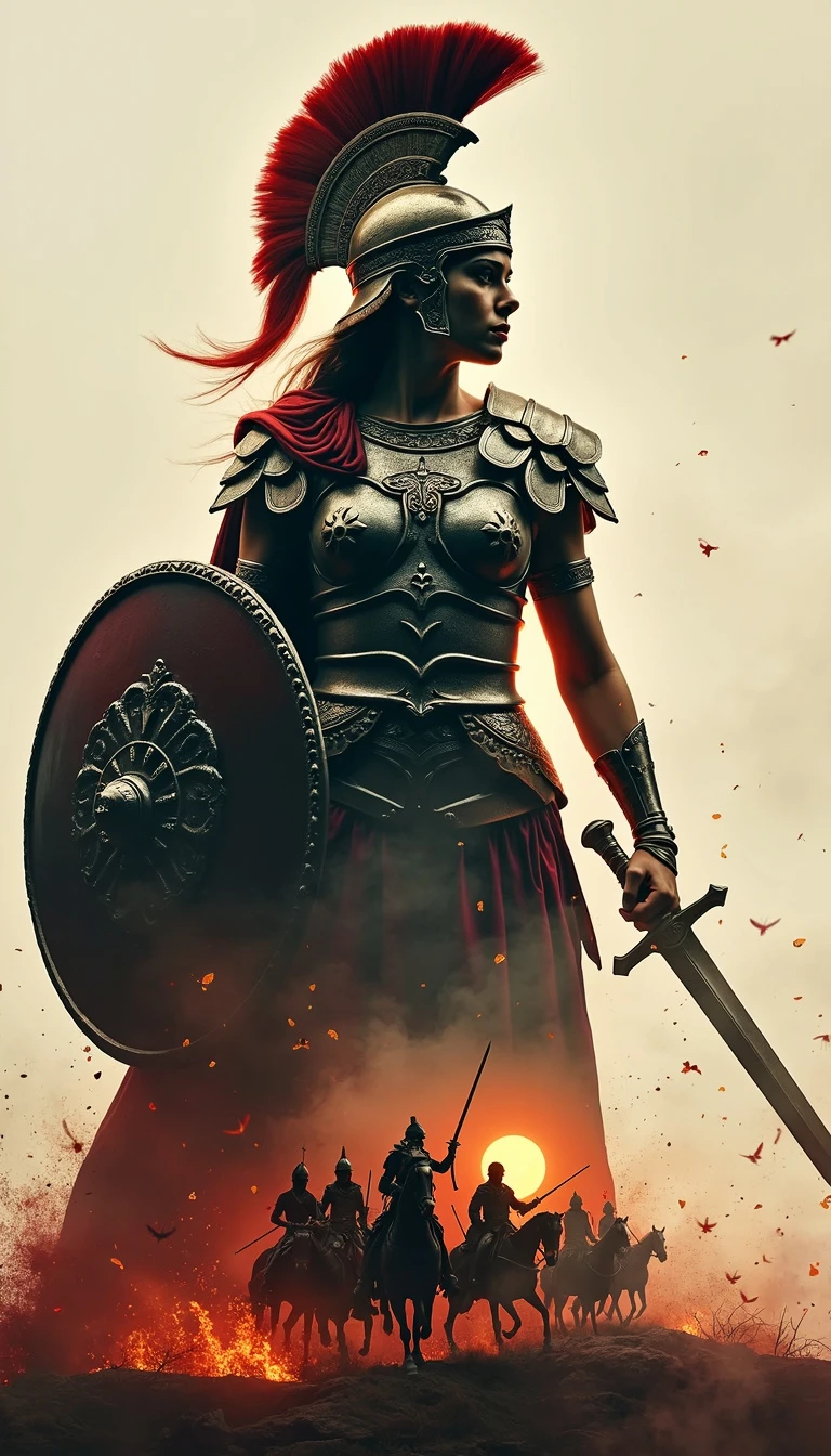 Create a powerful 8K resolution 3D double exposure artwork featuring a silhouette of Bellona, the Roman goddess of war, set against a simple backdrop. Within Bellona's form, incorporate: Her fierce gaze beneath a traditional Roman war helmet A sword raised in one hand and a shield in the other Armor adorned with Roman insignia and intricate designs Inside Bellona's silhouette, depict the intensity of battle: Roman legions charging into combat Flames, smoke, and the chaos of warfare Triumphal arches and scenes of victory parades celebrating conquest Use a color palette that blends: Fiery reds representing war and courage Metallic golds symbolizing armor and glory Deep blacks for strength and determination The overall composition should convey strength and valor, emphasizing Bellona's role as the fierce goddess of war and protector of Rome. Incorporate artistic styles inspired by Frank Frazetta's dynamic compositions, with dramatic lighting to enhance the intense atmosphere. Subtly integrate Roman symbols such as the eagle and laurel wreath throughout the artwork, symbolizing victory and power.
