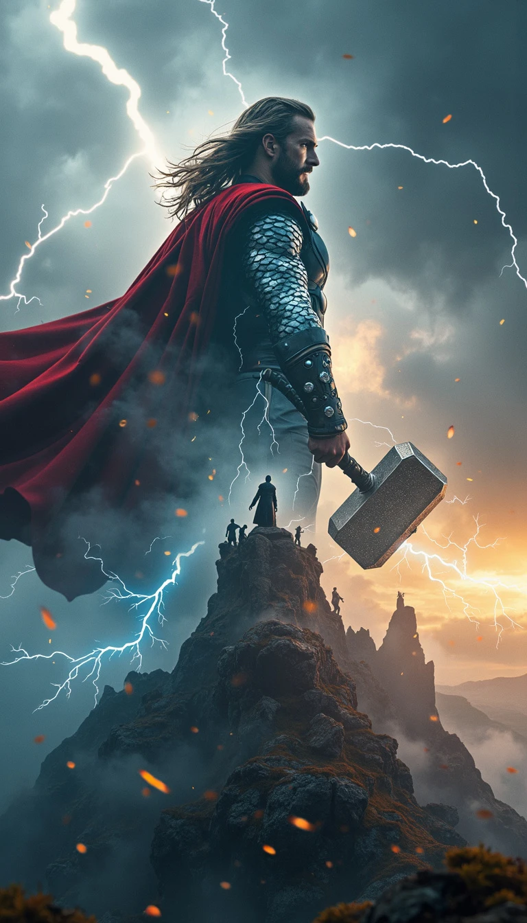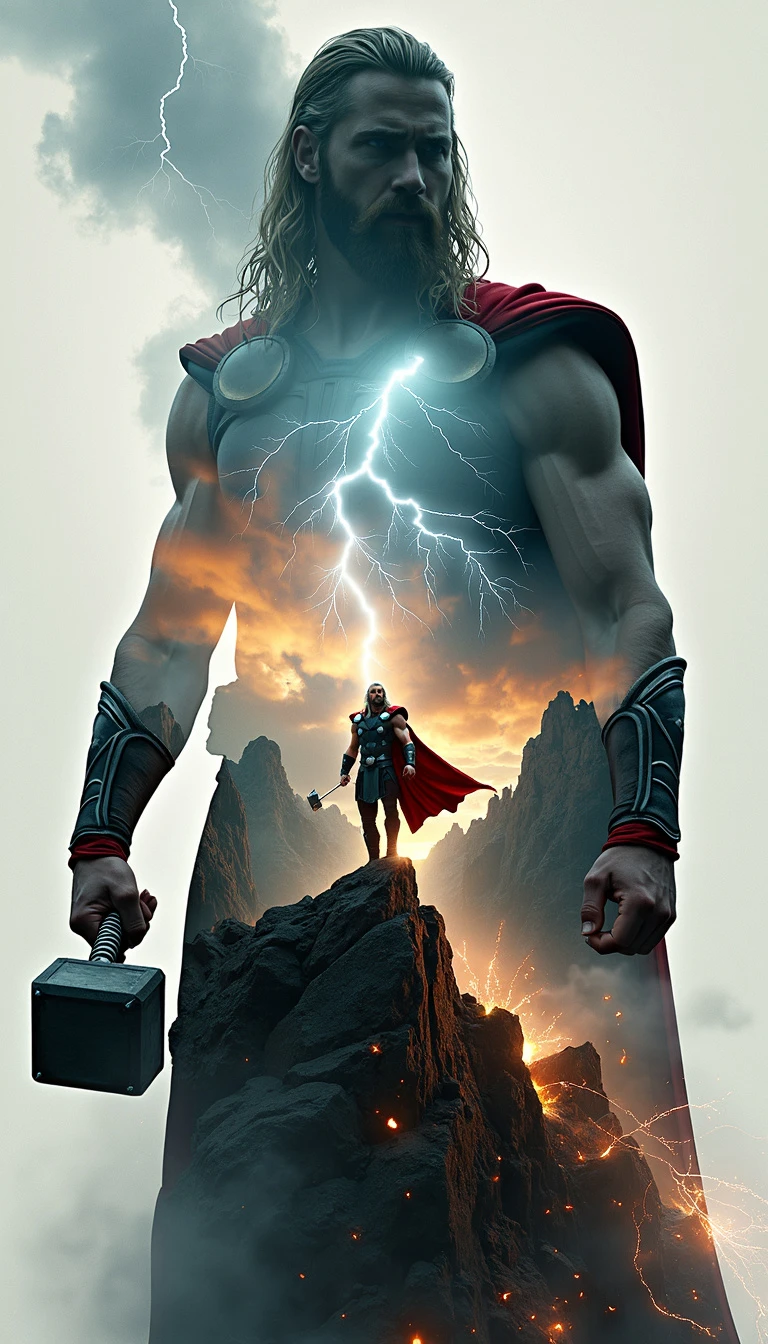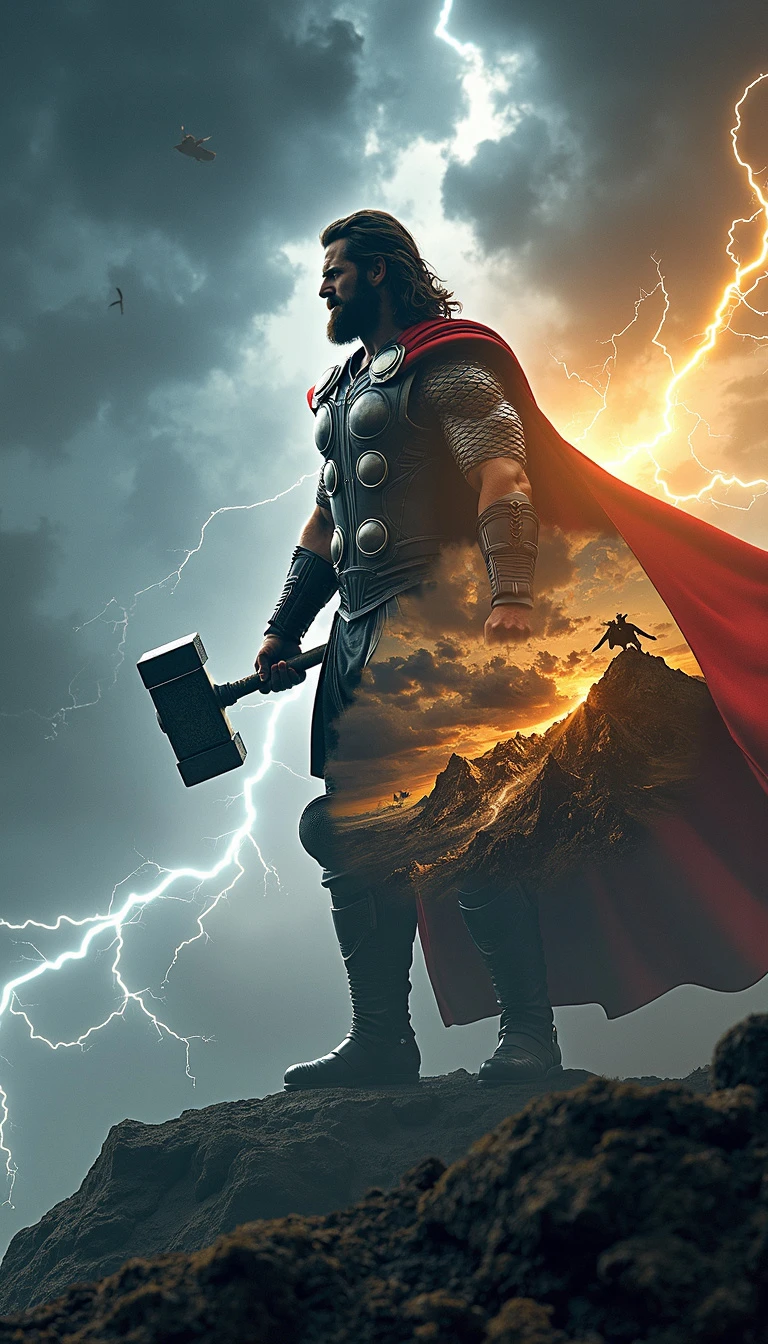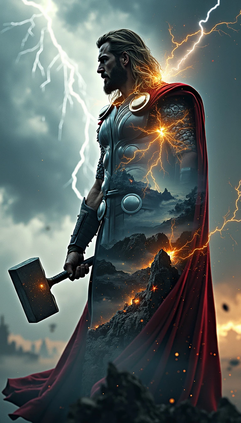 Create a powerful 8K resolution 3D double exposure artwork featuring a silhouette of Thor, set against a backdrop of a stormy sky filled with dark clouds and lightning. Within Thor's form, incorporate: His muscular figure wielding Mjölnir, his mighty hammer A flowing red cape billowing in the wind Lightning bolts emanating from his hammer Inside Thor's silhouette, depict scenes of strength and protection: Battles against giants and monstrous creatures Thunderstorms raging over rugged mountains The rainbow bridge, Bifrost, connecting realms Use a color palette that blends: Dark grays and blues representing storms and thunder Bright yellows and whites for lightning and divine power Metallic silvers symbolizing Mjolnir and armor The overall composition should convey strength and heroism, emphasizing Thor's role as the protector of gods and humans. Incorporate artistic styles inspired by epic fantasy illustrations, with dramatic lighting effects to enhance the dynamic atmosphere. Subtly integrate Norse symbols like Mjölnir and thunderbolts throughout the artwork, symbolizing power and protection.