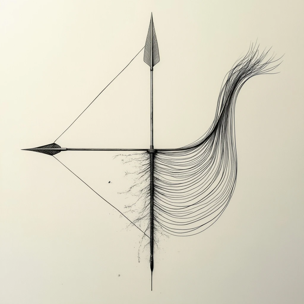 A minimalist, one-line drawing of the surrealistic abstract impression of an archery arrow made with multiple flowing lines