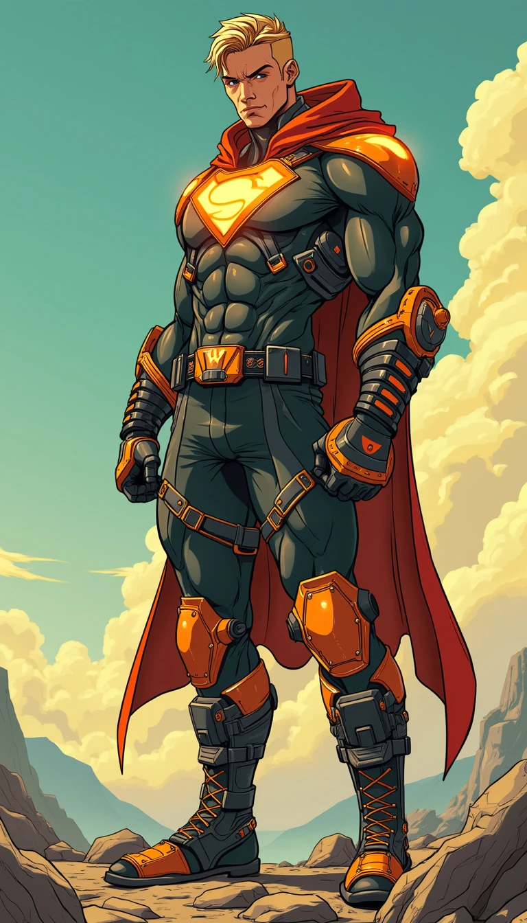 Full body male heroic hero character. Cyberpunk + Funny cartoon.