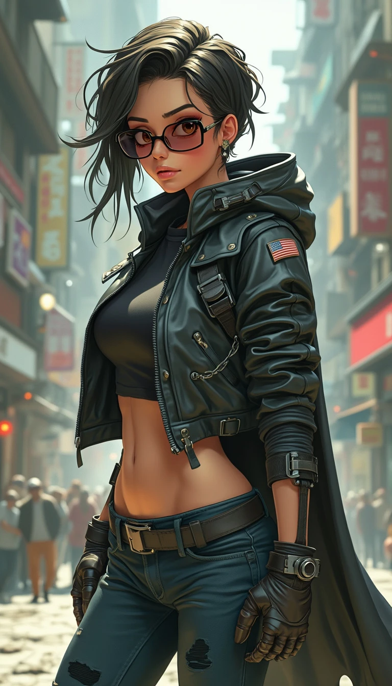 Full body female heroic hero character. Cyberpunk + Funny cartoon.