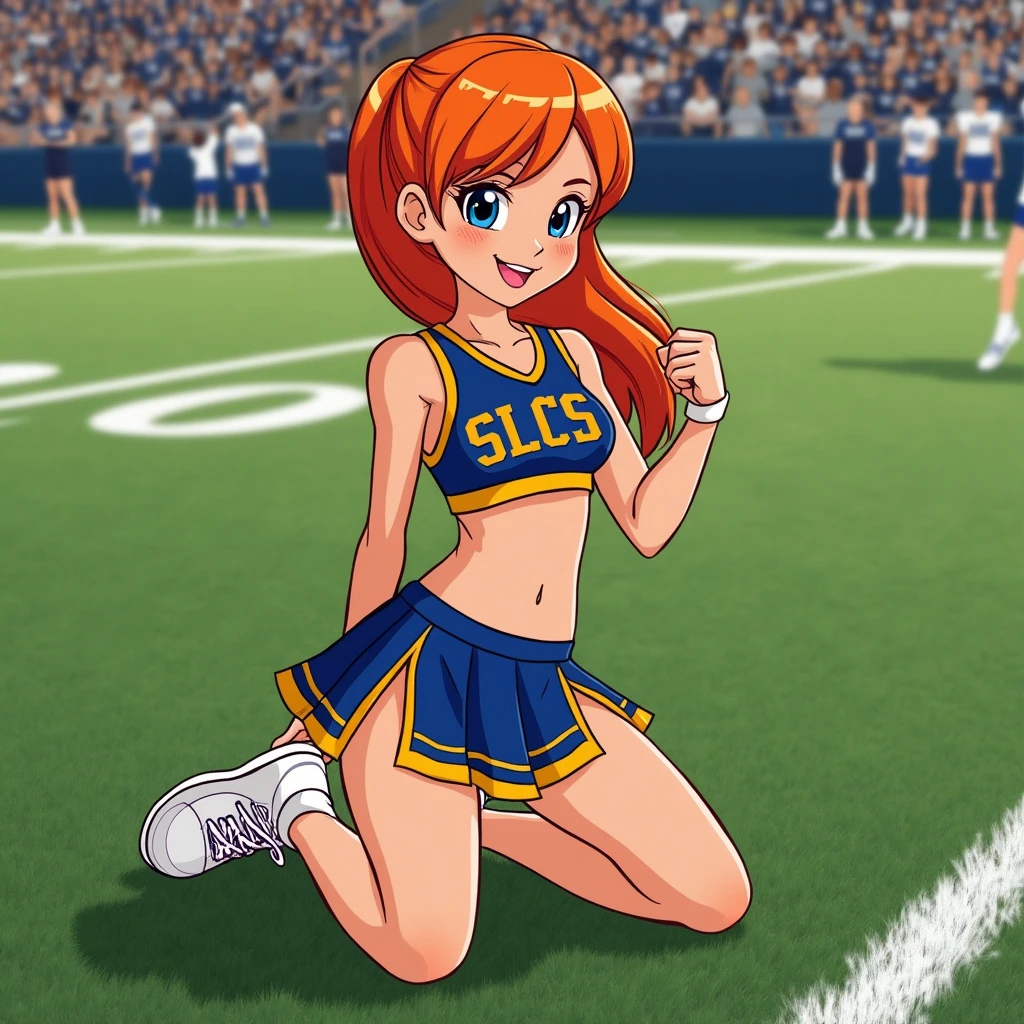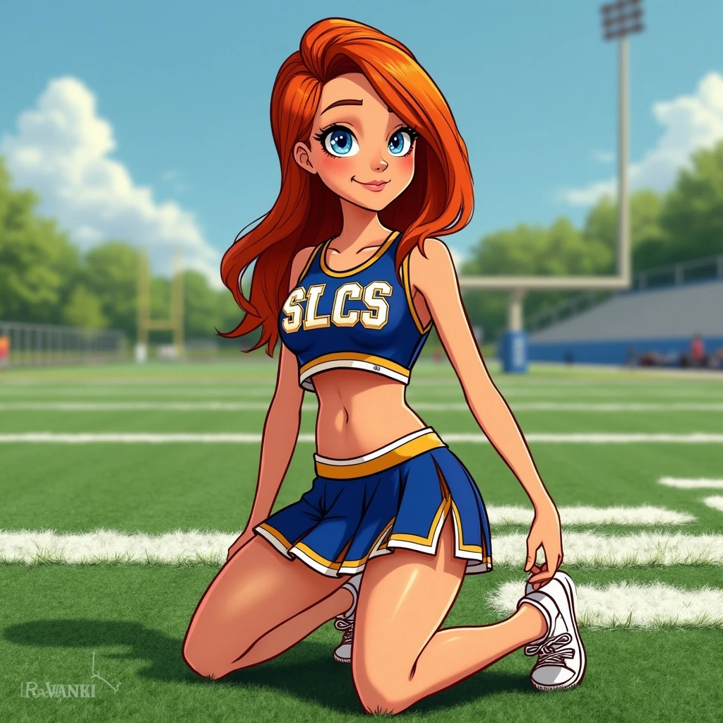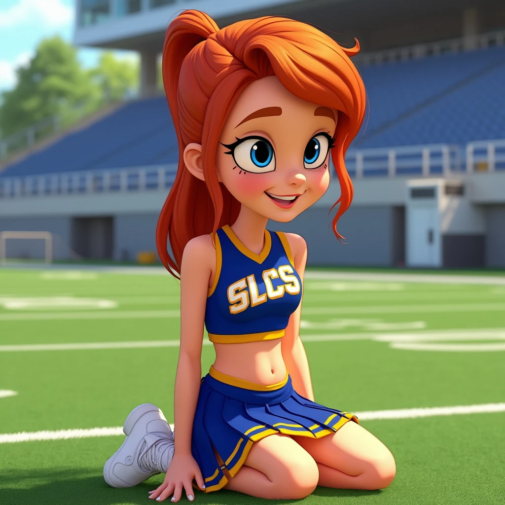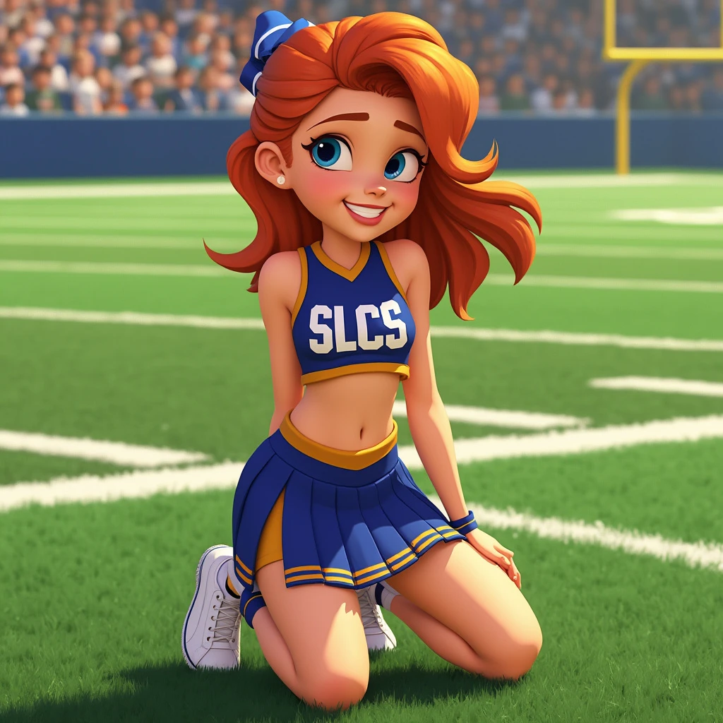 Cartoon animated character. Young woman with red ginger hair and blue eyes, cheerleader uniform blue and gold, pleated skirt with slits, sleeveless crop top with belly showing with the letters SLCS, white sneakers, kneeling on AstroTurf on a football field.