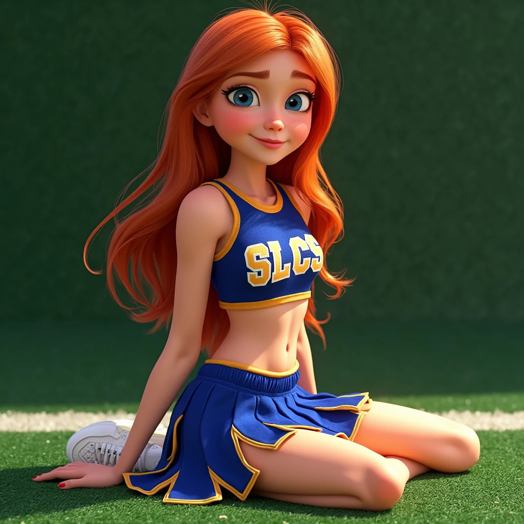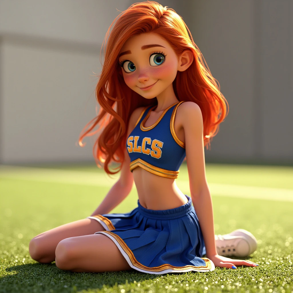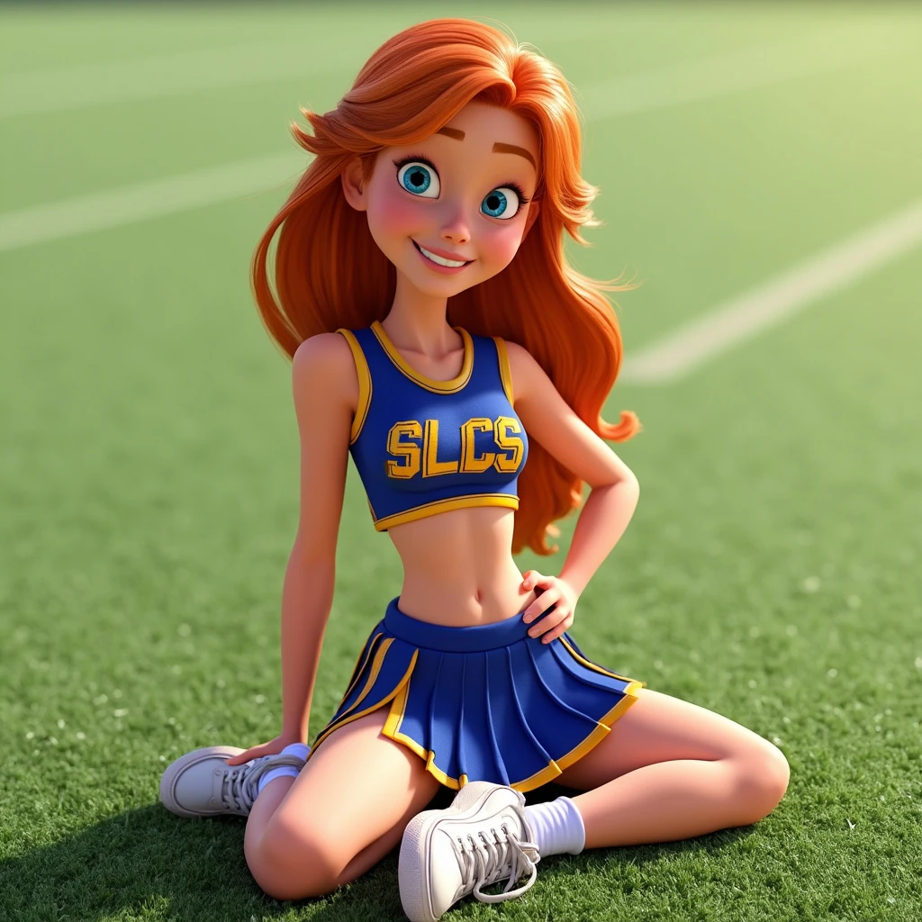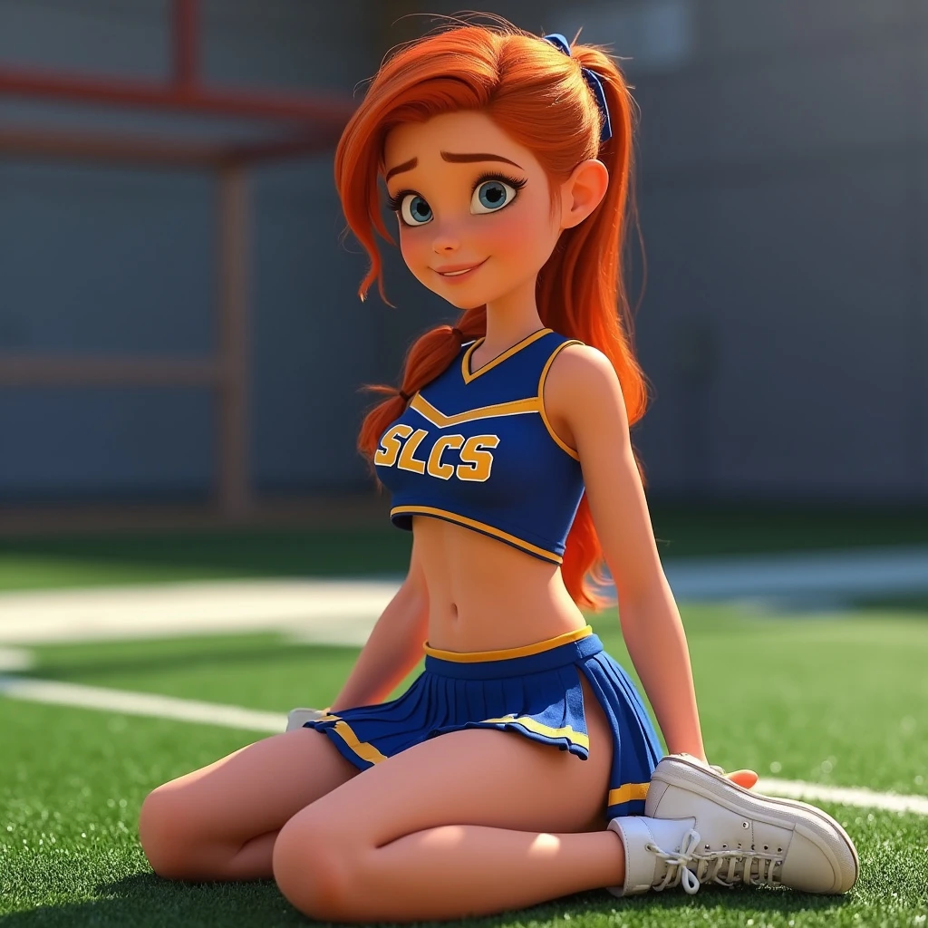 Pixar Disney animated character. Young woman with red ginger hair and blue eyes, cheerleader uniform blue and gold, pleated skirt with slits, sleeveless crop top with belly showing with the letters SLCS, white sneakers, sitting on AstroTurf.