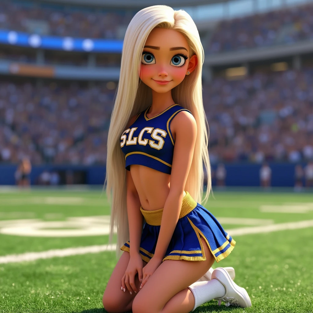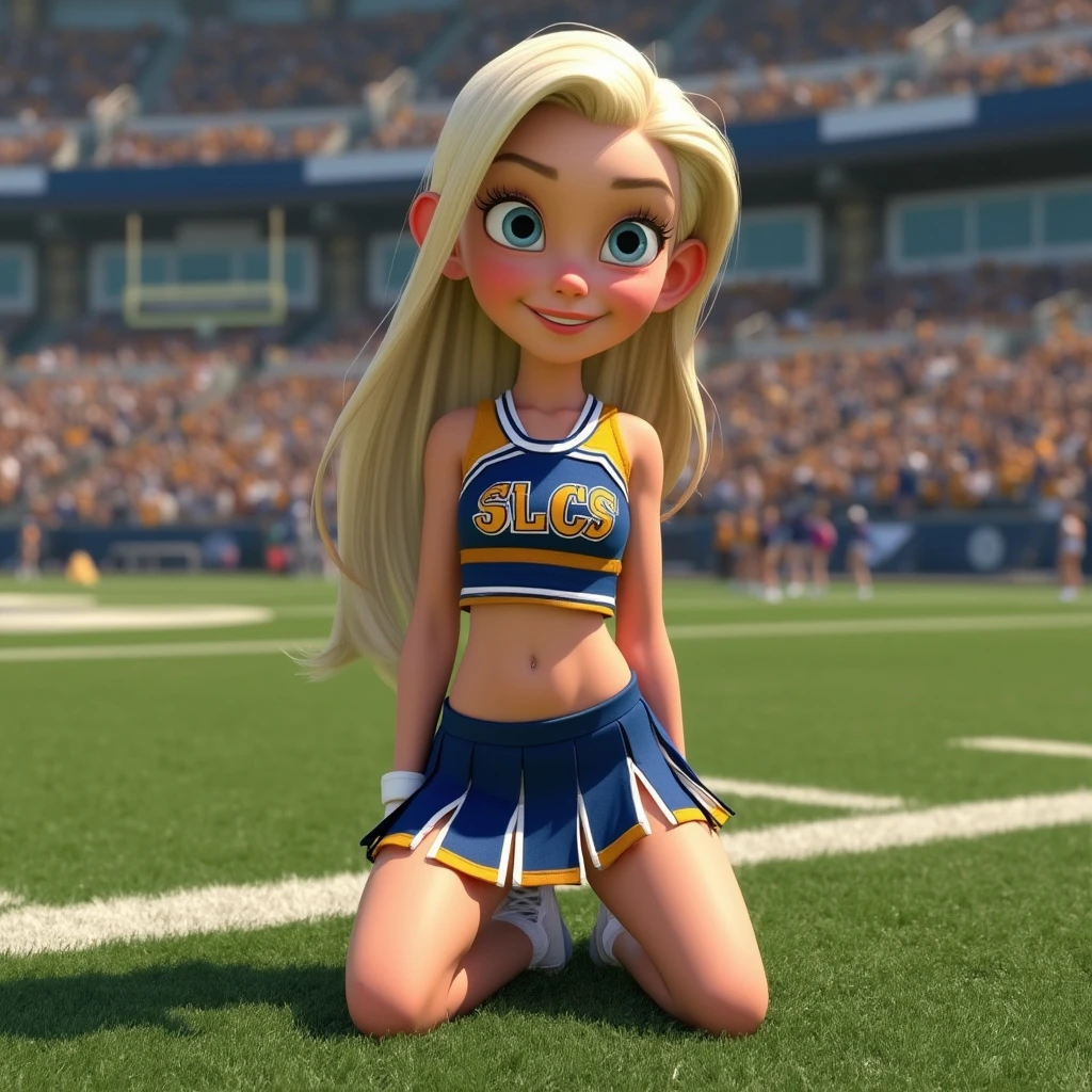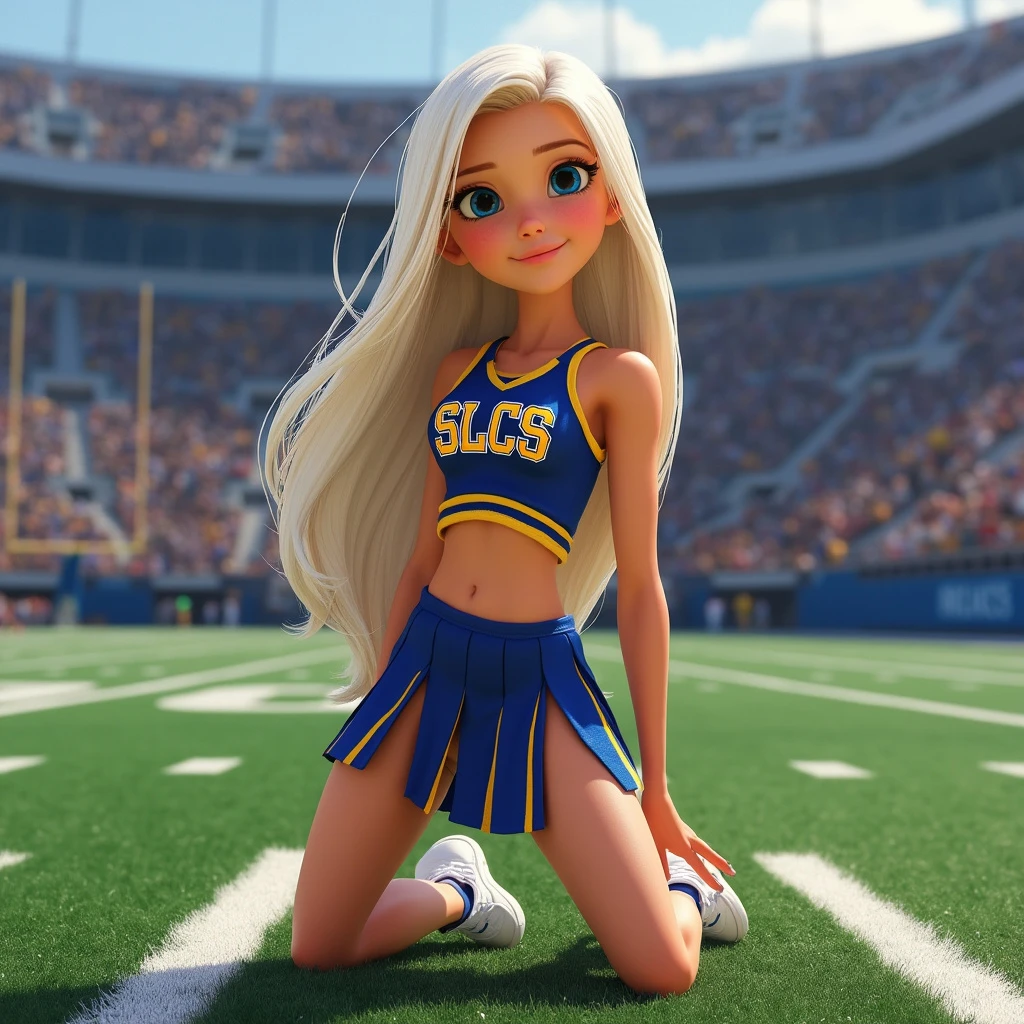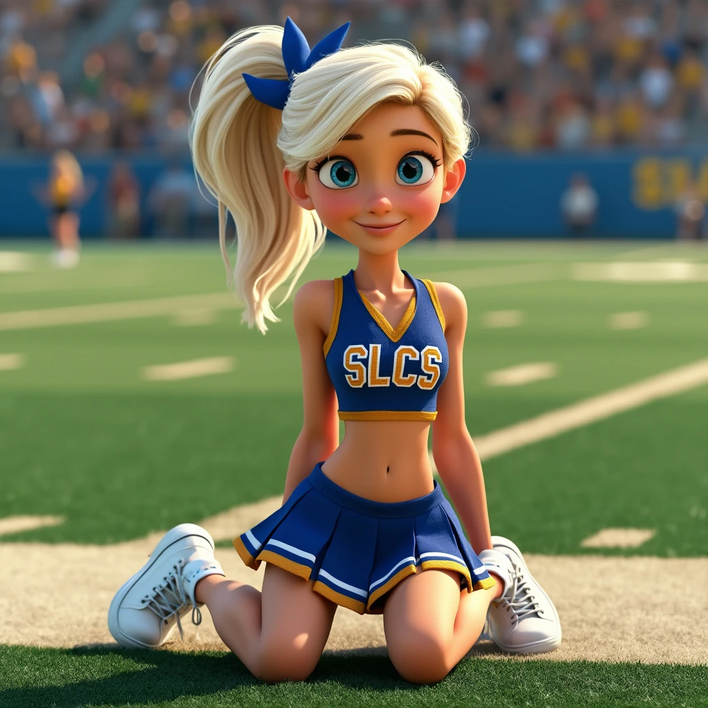 Pixar Disney animated character. Young woman with platinum blonde hair and blue eyes, cheerleader uniform blue and gold, pleated skirt with slits, sleeveless crop top with belly showing with the letters SLCS, white sneakers, kneeling on AstroTurf on a football field.