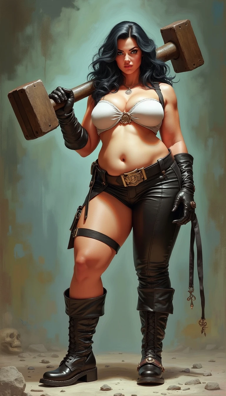 Full body fat female villain character with huge hummer weapon. Boris Vallejo + Funny cartoon.