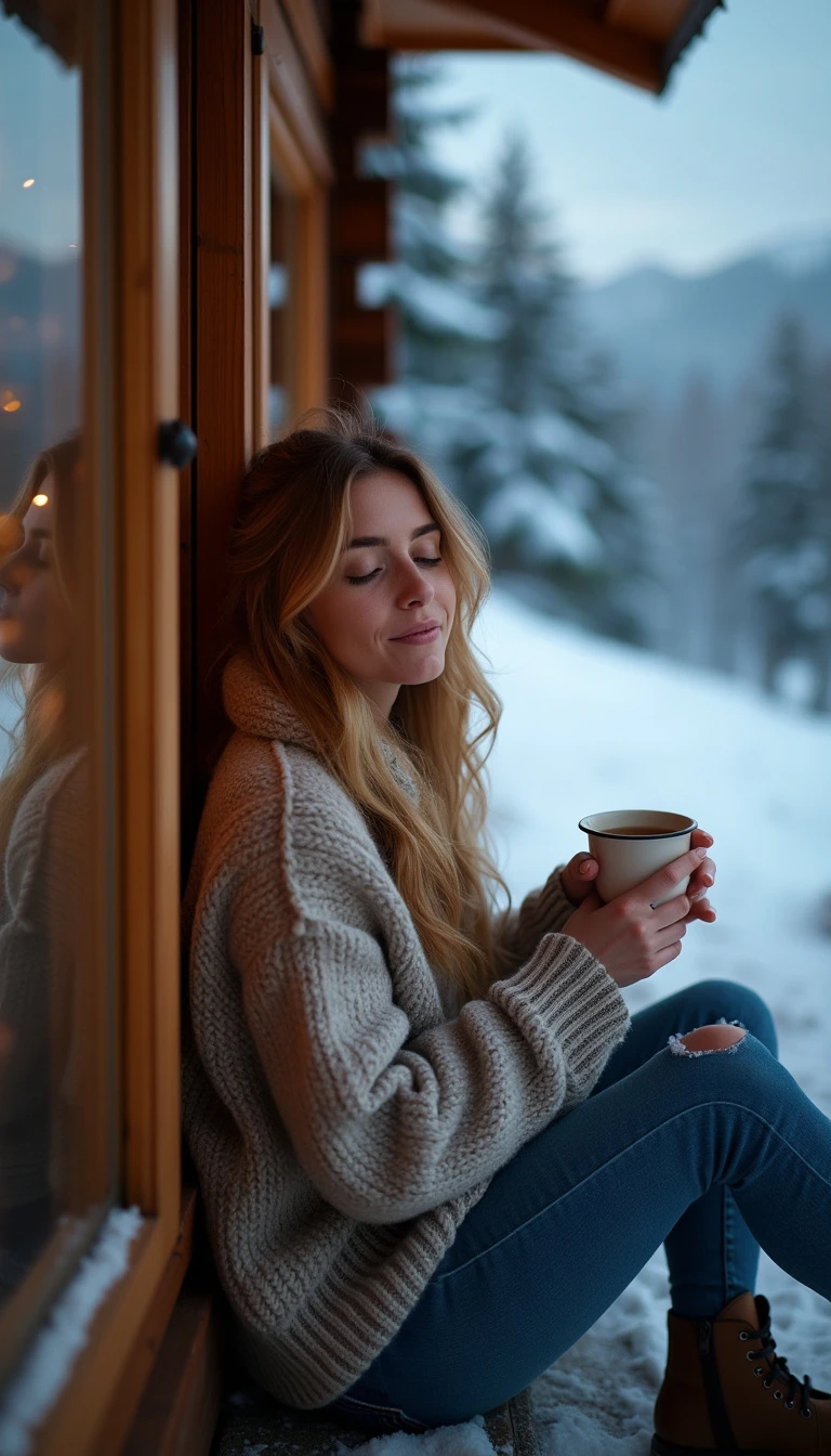 HR, MP, HQ, 8K, LR, PT, CL, VL, SD, EXD, RT, BF, BG, DOF. Subject: A Scandinavian woman in her mid-30s, wearing a cozy, woolen sweater and sitting on the porch of a wooden cabin nestled in the snowy mountains. It’s dusk, and the first stars are beginning to twinkle in the cold, crisp sky. She holds a cup of hot tea, her breath visible in the chilly air. The camera captures her from a 35mm lens at a close angle, focusing on the soft light (RT) from the cabin windows reflecting on her peaceful face. The background (BG) includes snow-covered pine trees fading into the distance, enhanced by soft bokeh effects. Volumetric lighting (VL) adds a warm, inviting glow to the scene, contrasting with the cool blue tones of the snowy landscape. WillDWilD Prompt Negativo: No NSFW, no over-the-top or fantasy elements. Keep the scene peaceful and grounded in the beauty of the snowy landscape, emphasizing comfort and tranquility. WillDWilD