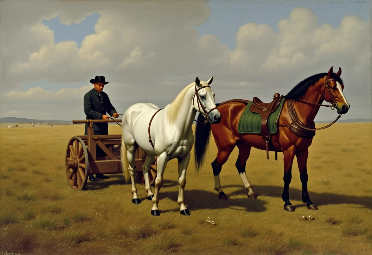 A masterpiece work by John William Waterhouse (1888) in the style of Classical 17th century oil painting , A painting of a man plowing a field with two horses, one white and one brown.