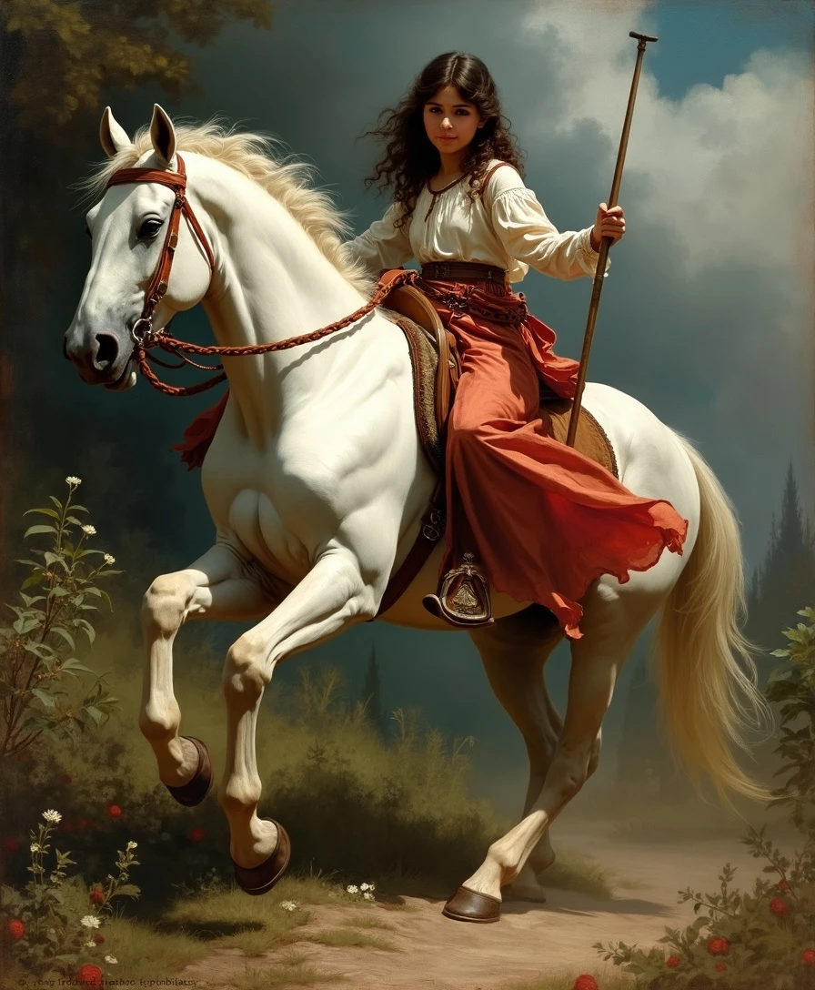 A masterpiece work by John William Waterhouse (1888) in the style of Classical 17th century oil painting , Persian cute girl riding horse (powerful strong white horse), nomad girl , looking to viewer. Boris Vallejo + Dark souls. majestic beatiful garden